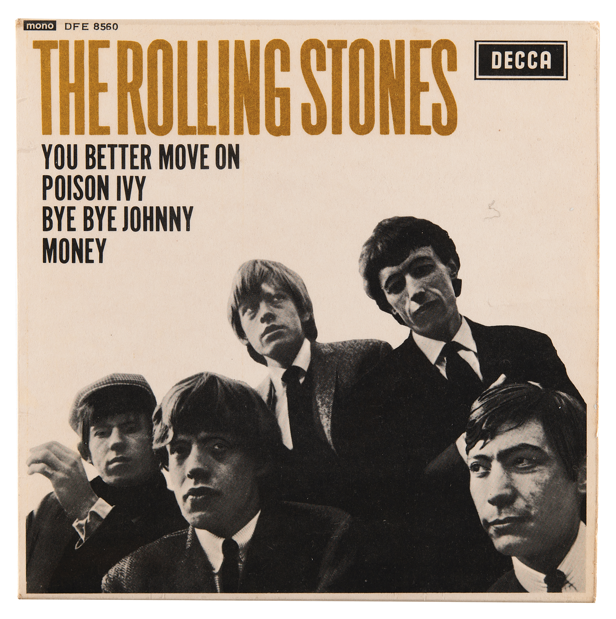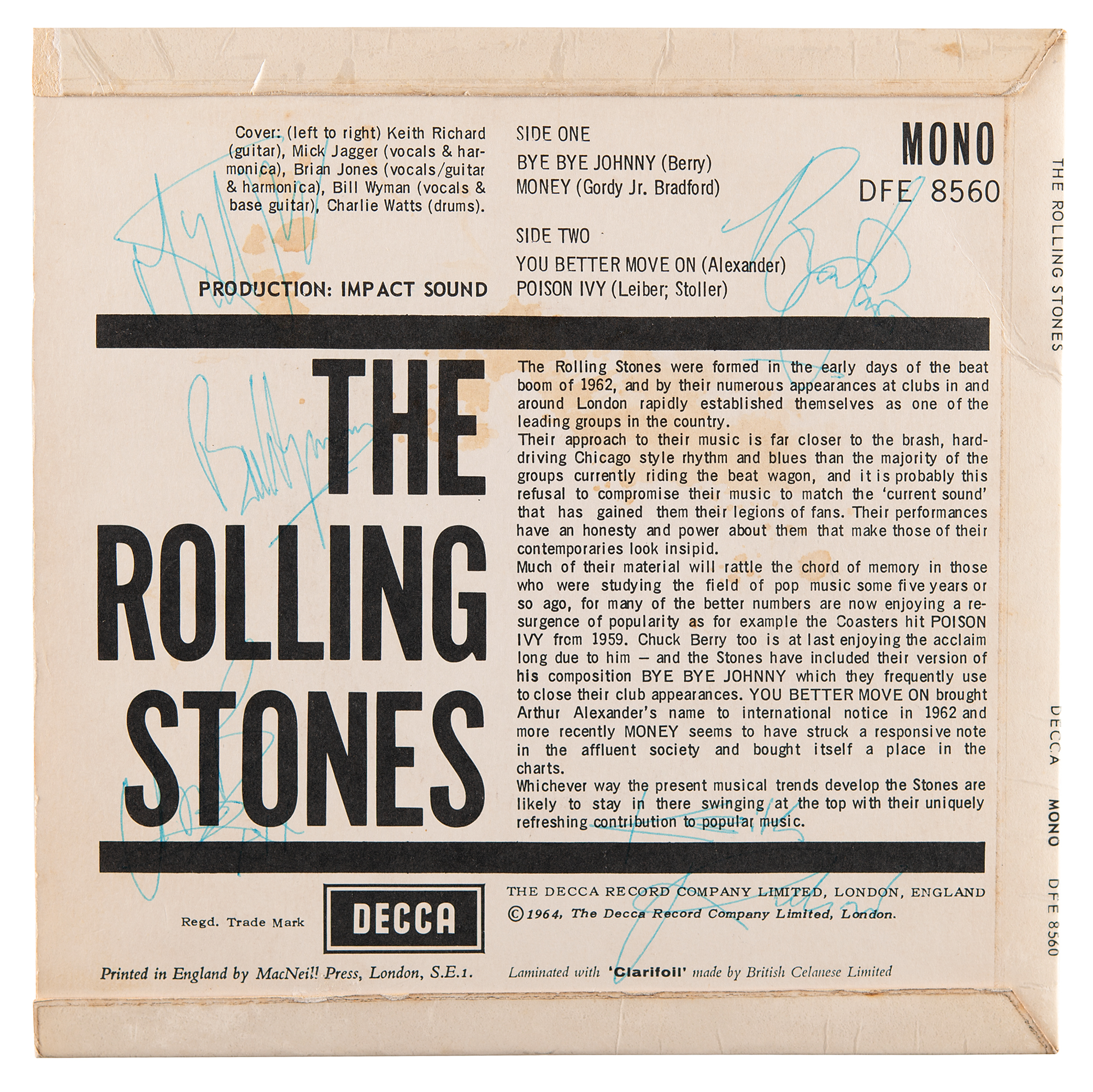 Scarce Decca Records 45 RPM record of the self-titled debut EP from The Rolling Stones (Mono DFE 8560), signed nicely on the back cover in blue ballpoint by Brian Jones, Mick Jagger, Keith Richards, Bill Wyman, and Charlie Watts. In fine condition, with scattered light staining. The record is not included. A popular Decca Records promotional card shares the same image featured on the cover of this debut EP, which Decca released in January 1964 to test the commercial appeal of the Rolling Stones before they committed to producing a full album.