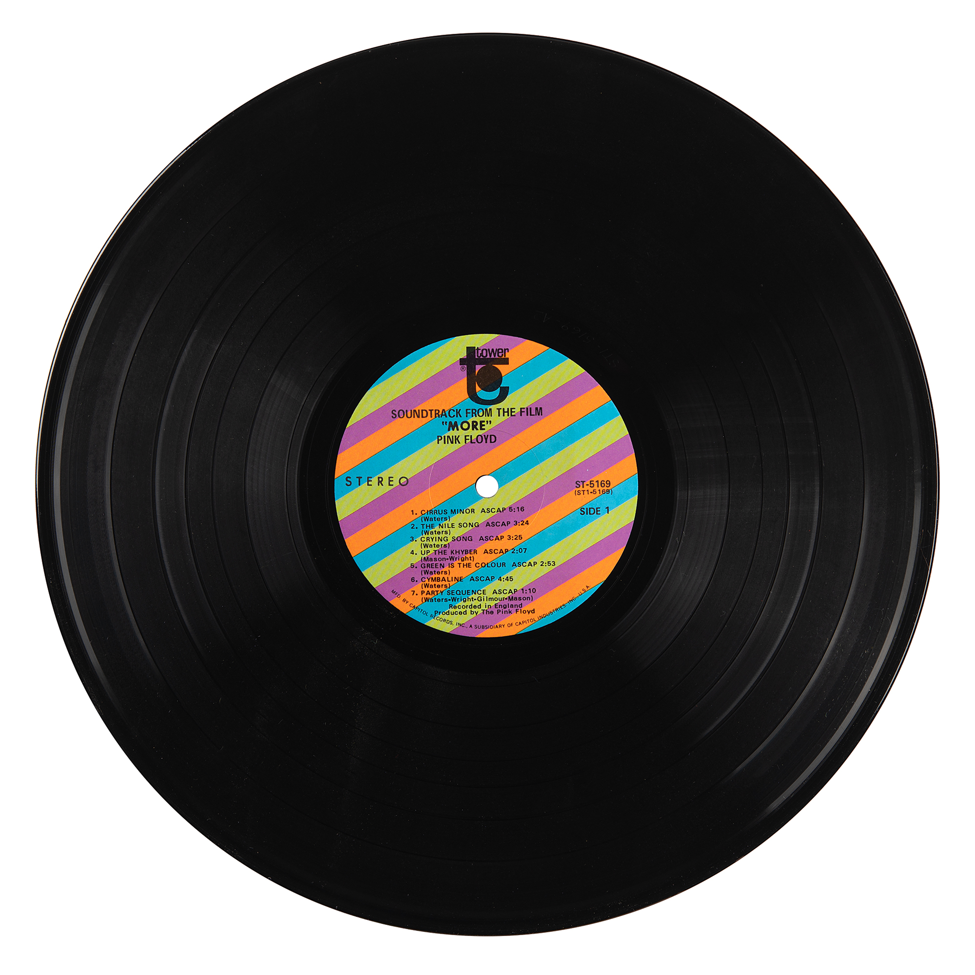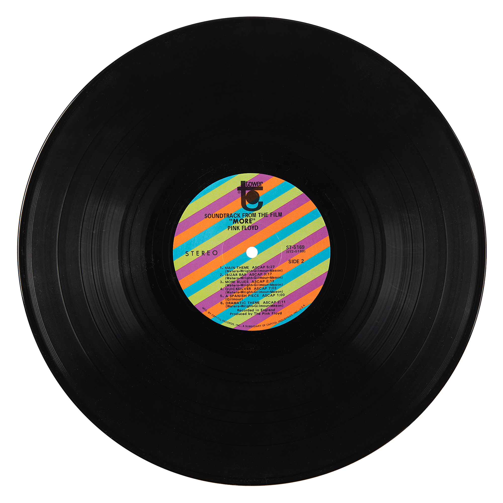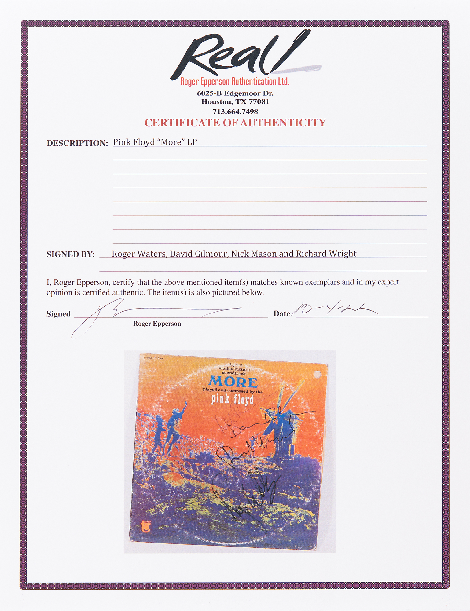 More soundtrack album by Pink Floyd, signed on the front cover in black felt tip by David Gilmour, Roger Waters, and Richard Wright, and in black ballpoint by Nick Mason. In very good to fine condition, with scuffing, edge wear, and a discount hole in the upper right corner. The record is included. Accompanied by full letters of authenticity from REAL and JSA.