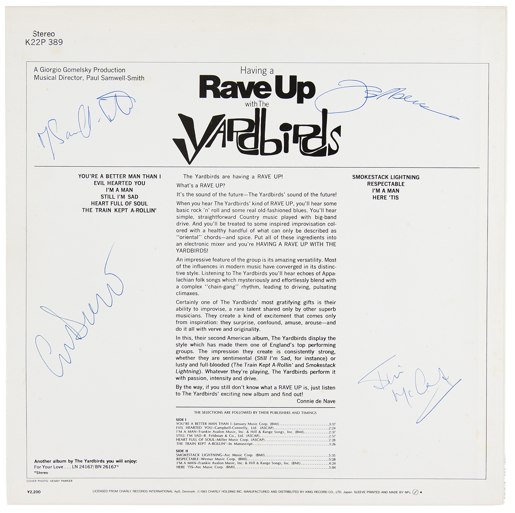 Having a Rave Up with the Yardbirds album signed on the back cover in ballpoint by Jeff Beck, Jim McCarty, Chris Dreja, and Paul Samwell-Smith. In very fine condition. The record is included.