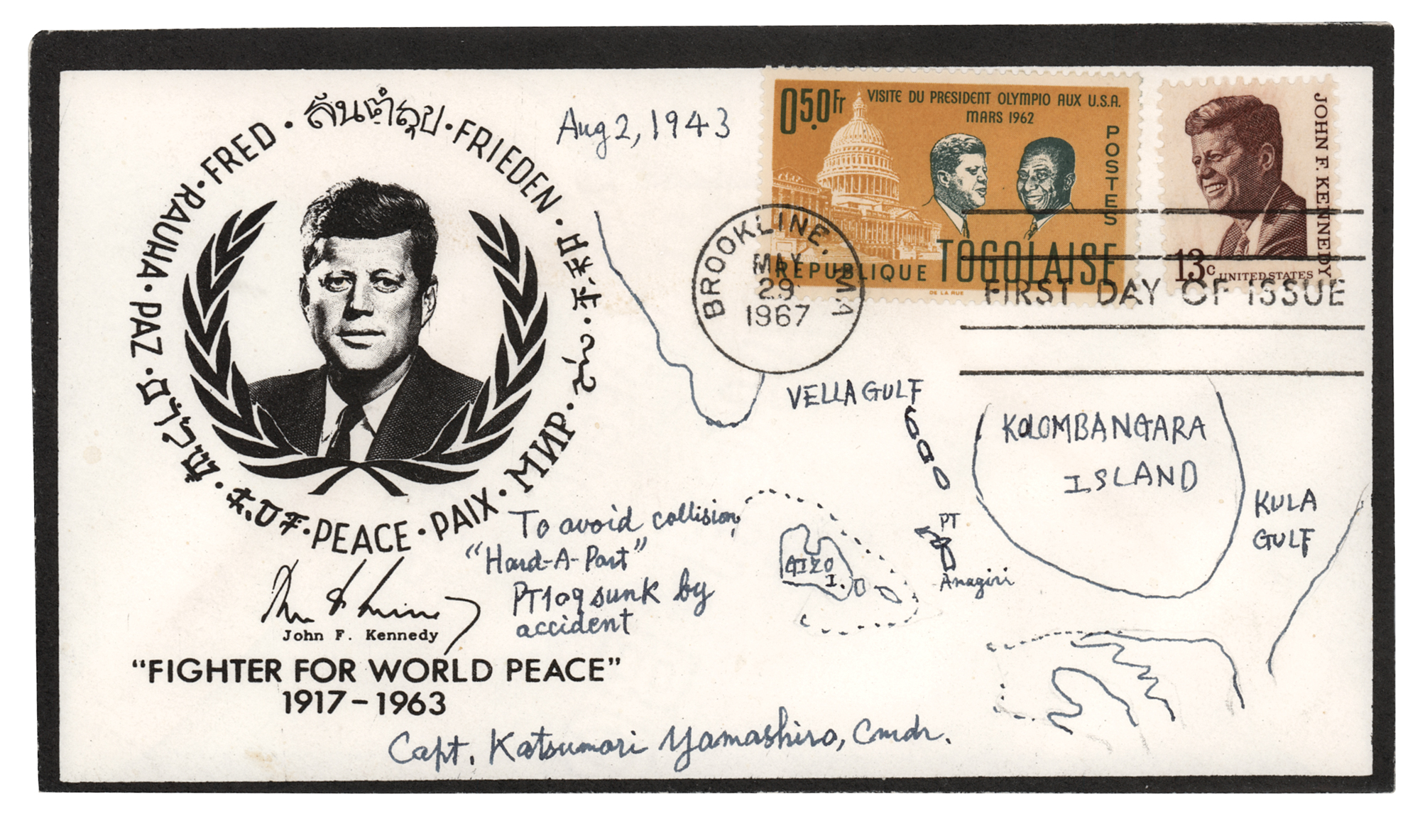 Japanese naval officer who commanded the 11th Flotilla (1900-1986) and who was Senior Officer on board the destroyer Amagiri on the night of the collision with John F. Kennedy's PT-109. Attractive black-bordered FDC with a cachet honoring the life of President John F. Kennedy as a 'Fighter for World Peace,' postmarked in Brookline, Massachusetts, on May 29, 1967, signed in black ink, "Capt. Katsumori Yamashiro, Comdr.," who adds a detailed map from “Aug. 2, 1843,” which charts the incident within the waterways of the Solomon Islands, noting “Kolombangara Island,” the “Kula Gulf,” the “Vella Gulf,” and the point of impact between Kennedy’s PT-109 and the Japanese destroyer Amagiri, with Yamashiro adding, “To avoid collision, ‘Hard-a-Port,’ PT109 sunk by accident.” In very fine condition.
