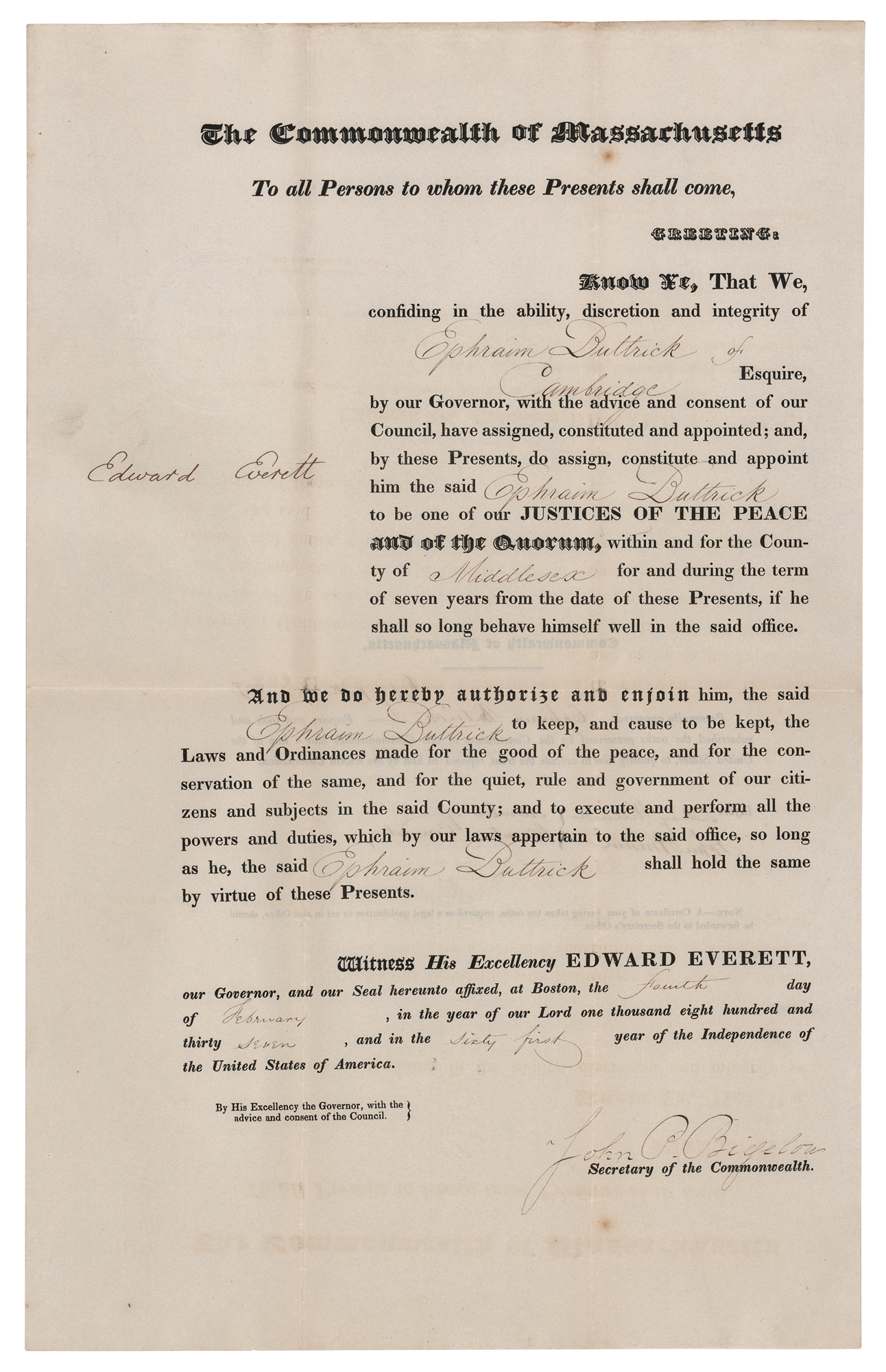 American statesman (1794–1865) renowned for his oratory, best remembered for giving the speech preceding Lincoln's Gettysburg Address. Partly-printed DS as Governor of Massachusetts, one page, 10.25 x 16.25, February 4, 1837. Governor Everett appoints Ephraim Buttrick as “one of our Justices of the Peace and of the Quorum, within and for the County of Middlesex for and during the term of seven years.” Signed neatly in the upper left by Edward Everett below an embossed seal, and countersigned by John P. Bigelow as secretary of the Commonwealth. In fine condition, with faint toning along the intersecting folds.