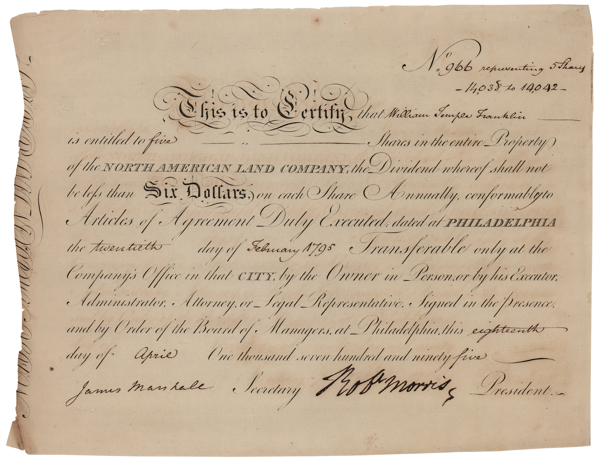 Important financier (1734-1806) who signed the Declaration of Independence, Articles of Confederation, and Constitution. Partly-printed DS, signed “Rob't Morris,” one page, 12.25 x 9.5, April 18, 1795. Stock certificate issued to "William Temple Franklin" for five shares in the entire property of the North American Land Company. Signed boldly at the conclusion by Robert Morris as president, and countersigned by the company's secretary, James Marshall, the brother of Chief Justice and Secretary of State John Marshall. In fine condition. Morris was eventually bankrupted by land speculations and served a few years in the Prune Street prison until released by the passage of the national bankruptcy law in 1802.