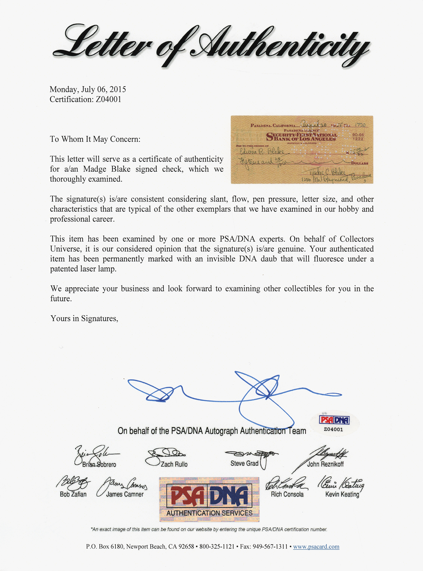 First National Bank of Los Angeles check, 6 x 2.75, filled out and signed by Blake, "Madge C. Blake, 1306 No. Raymond, Pasadena," payable to Edwin R. Blake for $15, August 20, 1955. In fine condition, with expected bank stamps and cancellation holes. Accompanied by a full letter of authenticity from PSA/DNA.