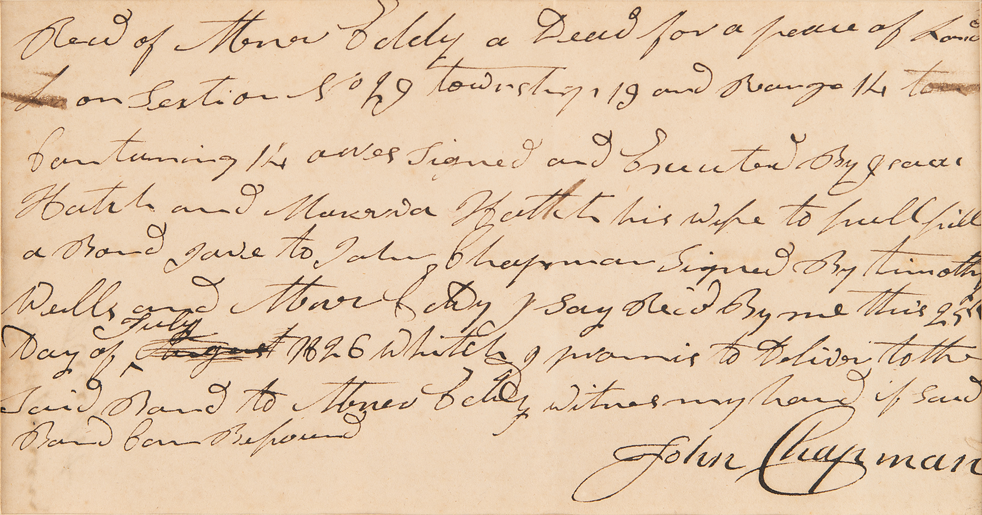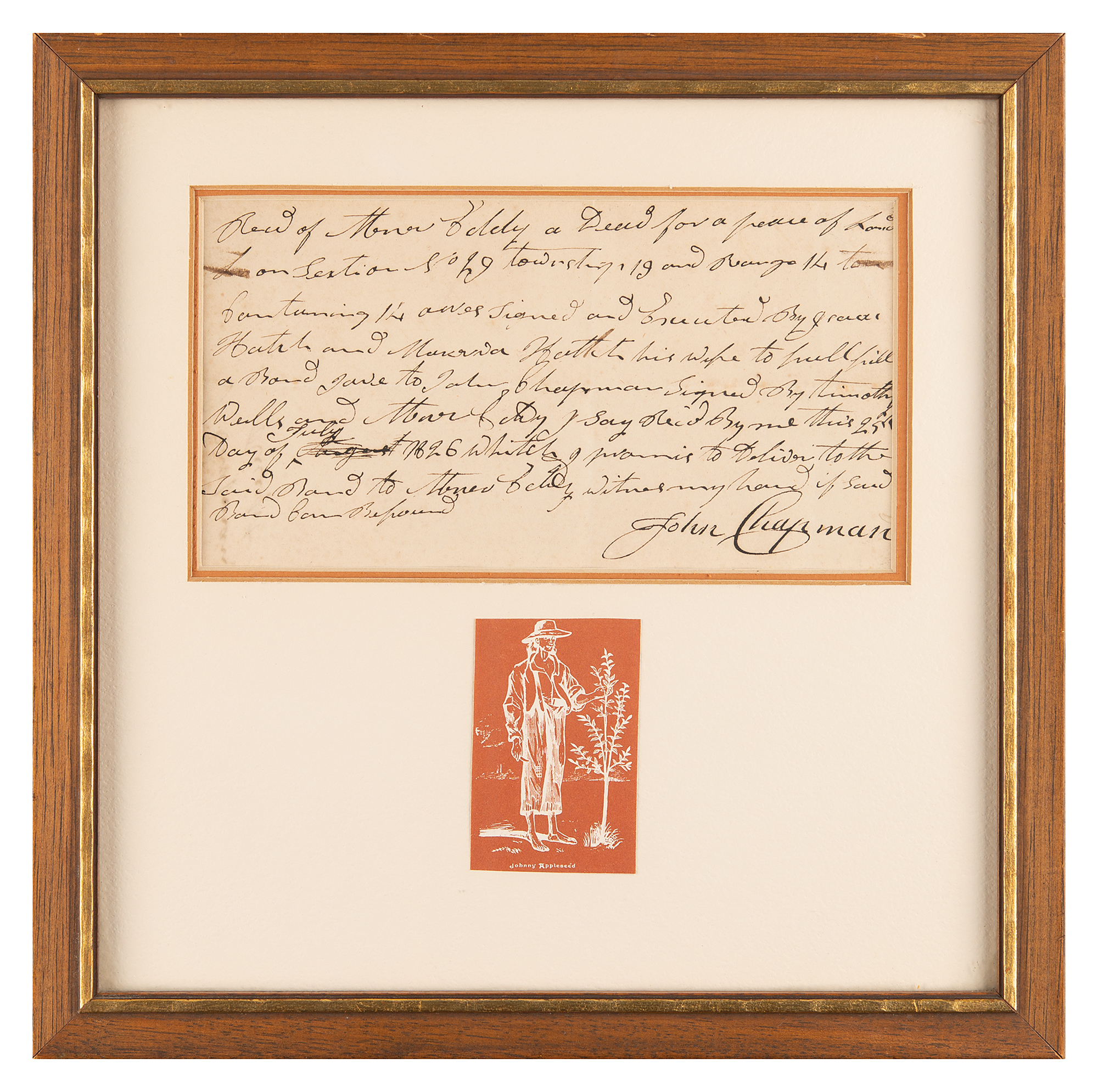 American pioneer nurseryman (1774–1845) who introduced apple trees to large parts of Pennsylvania, Ohio, Indiana, Illinois, and Ontario, as well as the northern counties of West Virginia. ALS signed “John Chapman,” one page, 7.5 x 4, July 25, 1826. Handwritten document by Johnny Appleseed, in part: "Rec'd…a deed for a peace of Land on Section 29, Township 19 and Range 14 containing 14 acres…& Bond gave to John Chapman signed by Timothy Wells." Attractively matted and framed with a small image of Johnny Appleseed to an overall size of 11 x 11. In fine condition.