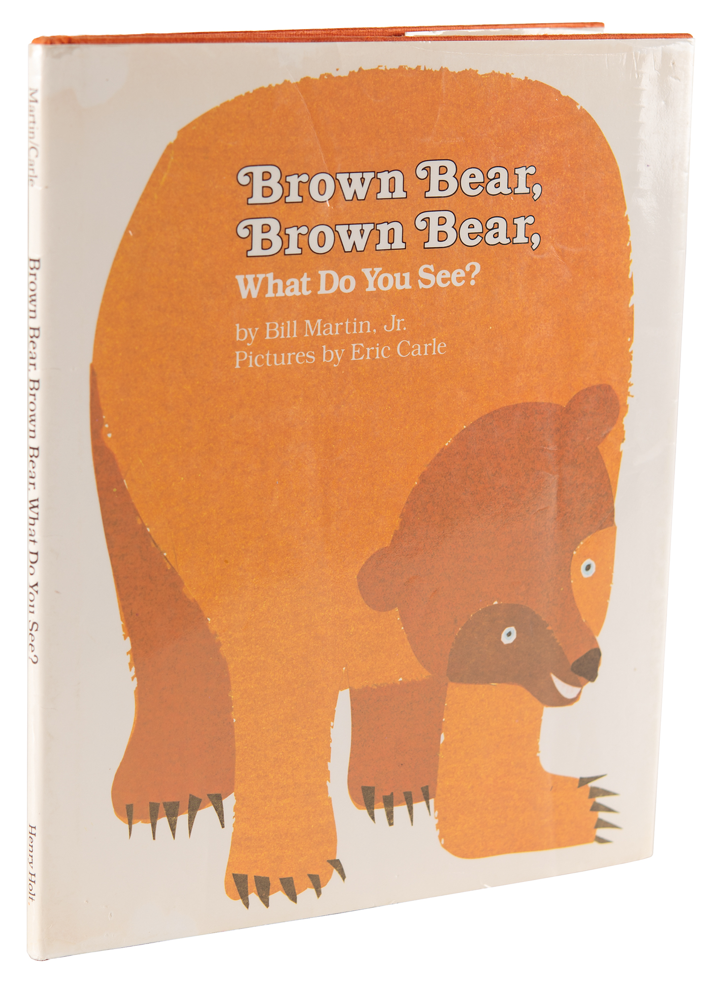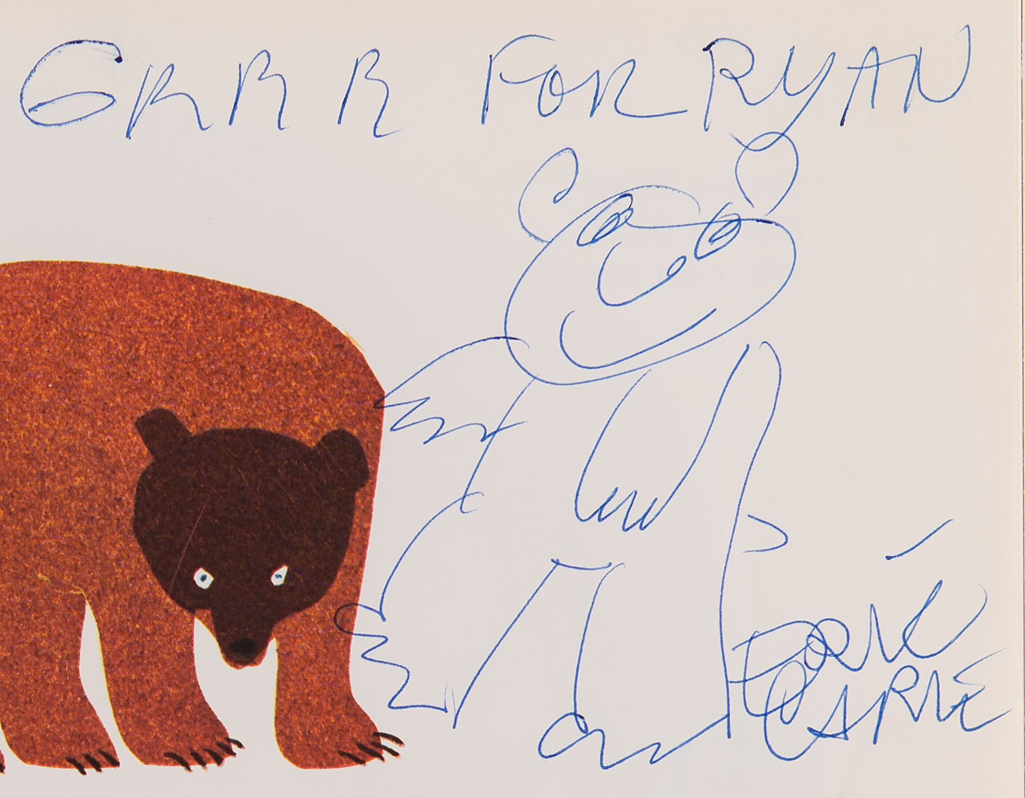 Signed book: Brown Bear, Brown Bear, What Do You See? Later printing. NY: Henry Holt and Company, 1967. Hardcover with dust jacket, 8.25 x 10.25, 25 pages. Signed and inscribed on the title page in blue ballpoint, "Grrr, for Ryan, Eric Carle," adding a large sketch of the titular bear. In fine condition.