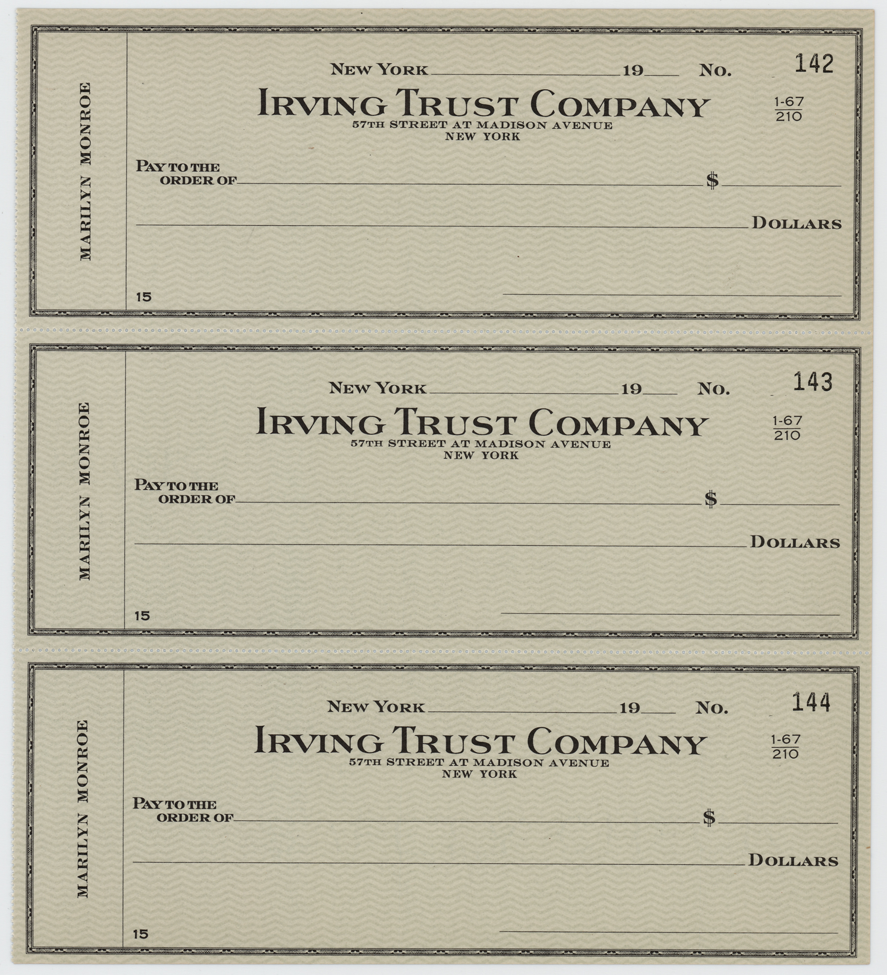 Perforated sheet of three unused Marilyn Monroe personal checks with consecutive numbers of 142, 143, and 144, one page, 8.25 x 9.25, for her account with the Irving Trust Company, New York. In fine condition.