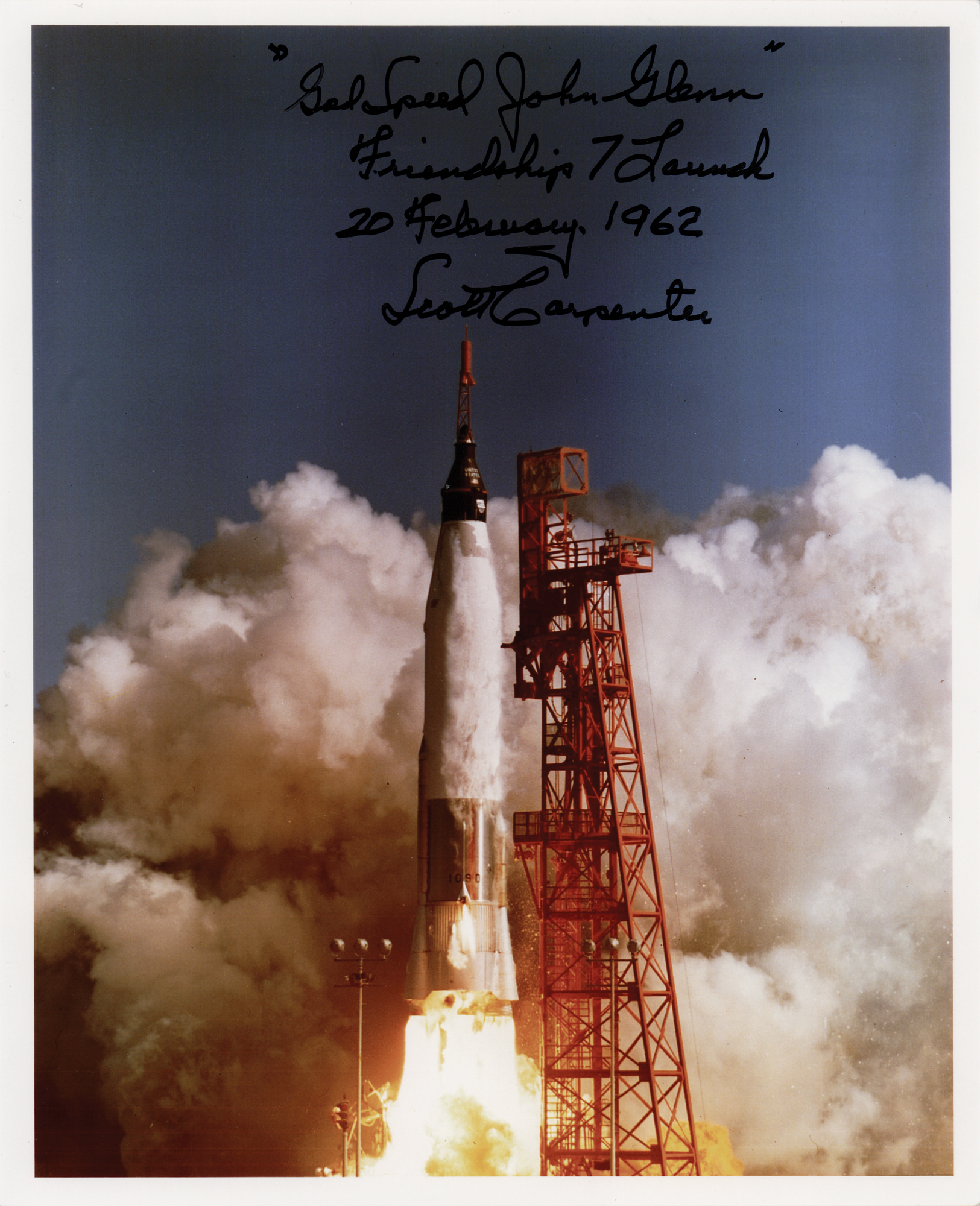 Color satin-finish 8 x 10 photo of the Atlas LV-3B rocket launching the Mercury-Atlas 6 mission, signed in black felt tip, “‘Godspeed John Glenn,’ Friendship 7 Launch, 20 February 1962, Scott Carpenter.” In very fine condition.