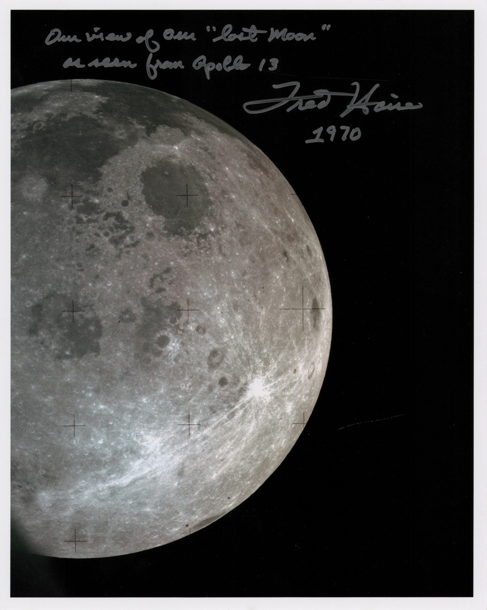 Beautiful color satin-finish 8 x 10 photo of the moon as viewed from outer space during the Apollo 13 mission, signed in silver ink, “Our view of our ‘lost moon’ as seen from Apollo 13, Fred Haise, 1970.” In fine condition.