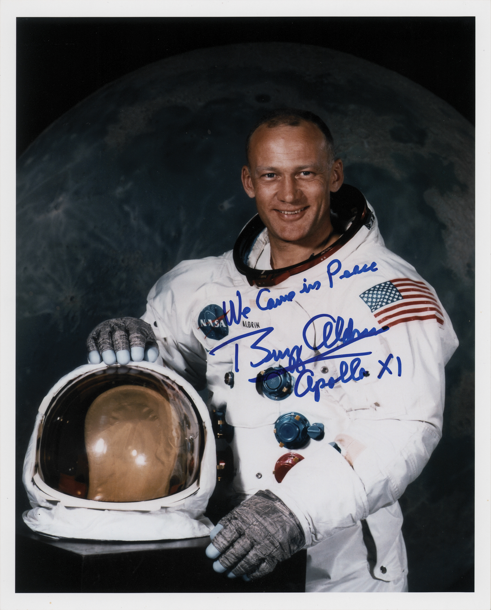 Color satin-finish 8 x 10 photo of Buzz Aldrin wearing his white space suit against a lunar backdrop, signed in blue felt tip, “We came in peace, Buzz Aldrin, Apollo XI.” In fine condition.