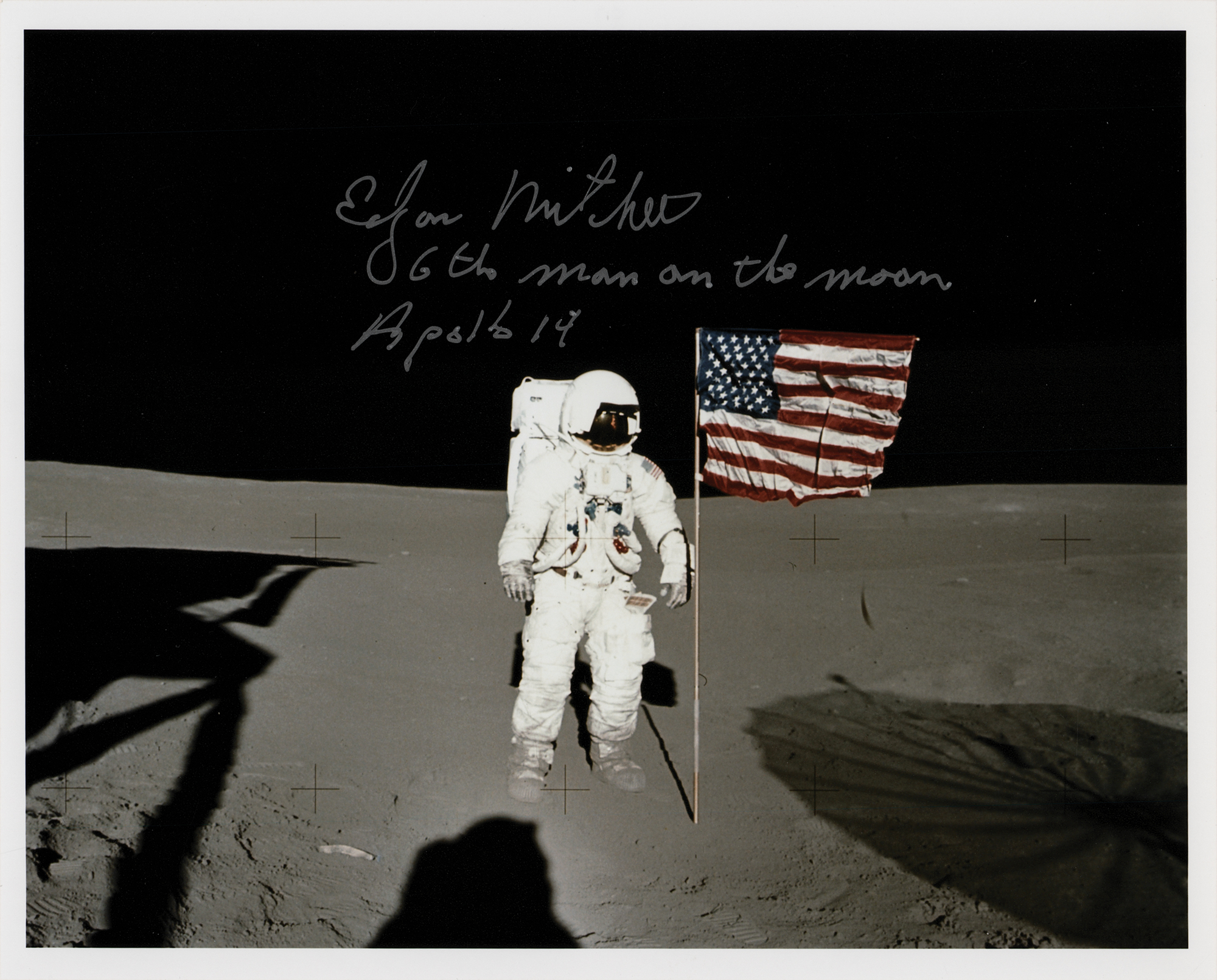 Color satin-finish 10 x 8 photo of Mitchell standing next to the American flag on the lunar surface, signed in silver ink, “Edgar Mitchell, 6th man on the moon, Apollo 14.” In very fine condition.