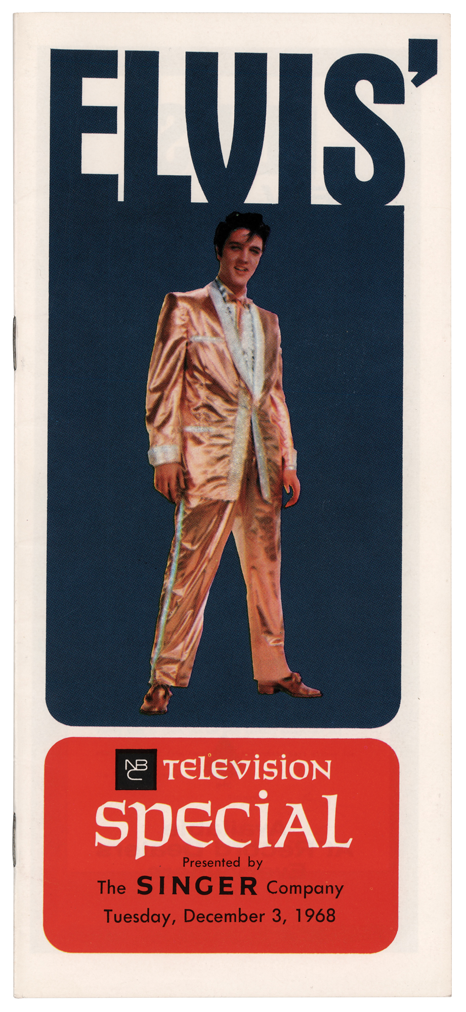 Original 4 x 9 promotional booklet for Elvis Presley's "NBC Television Special," presented by The Singer Company on December 3, 1968, 32 pages, listing the NBC stations across the country that would be broadcasting the Christmas special, plus advertisements for his many records available "at record dealers everywhere." In fine condition.