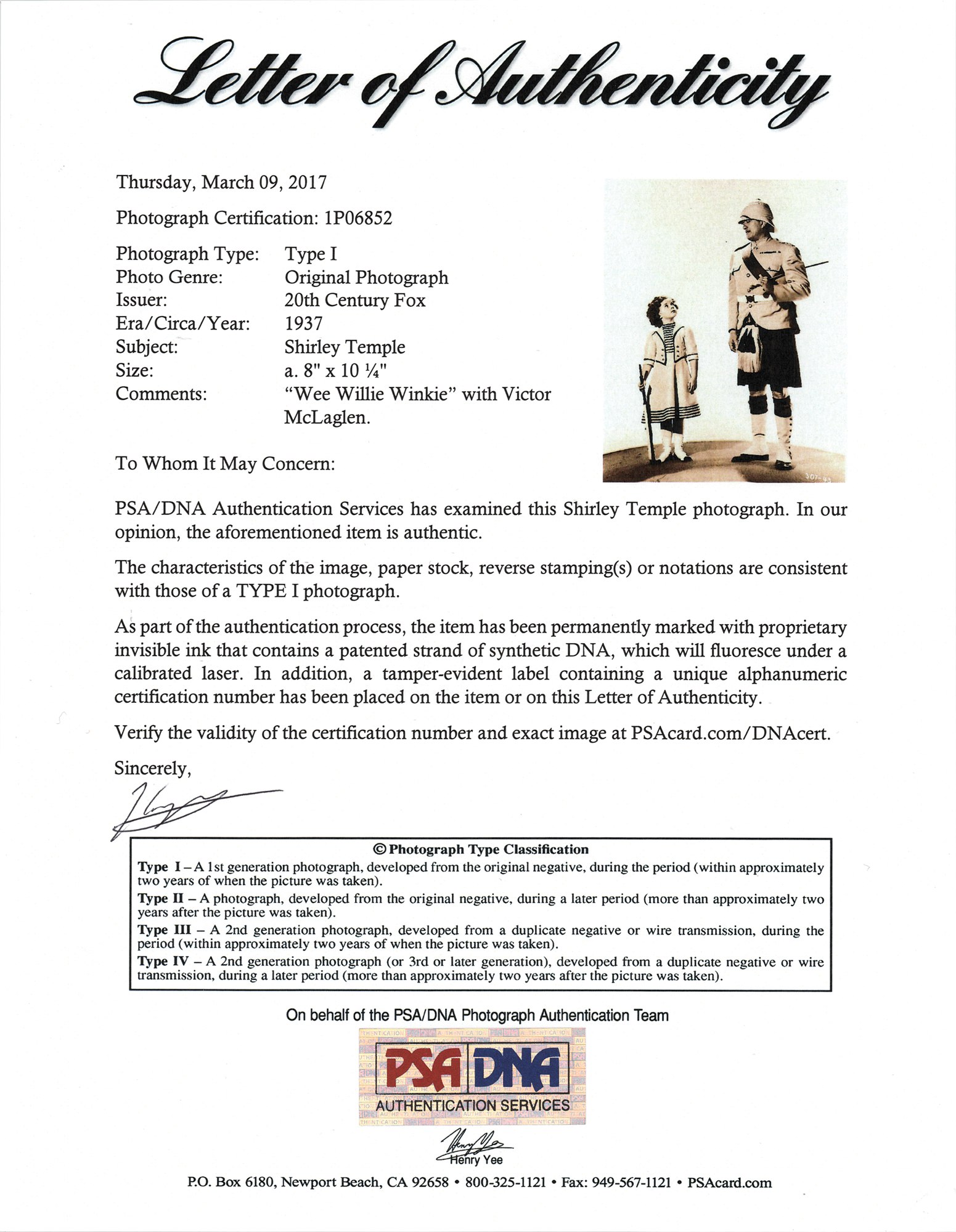 Original vintage circa 1937 glossy 8 x 10.25 publicity photo for Shirley Temple and Victor McLaglen in Wee Willie Winkie, a 20th Century-Fox adventure drama film directed by John Ford. In very good to fine condition, with scattered light creasing. Accompanied by a full letter of authenticity from PSA/DNA, identifying it as an authentic "Type I" photograph.