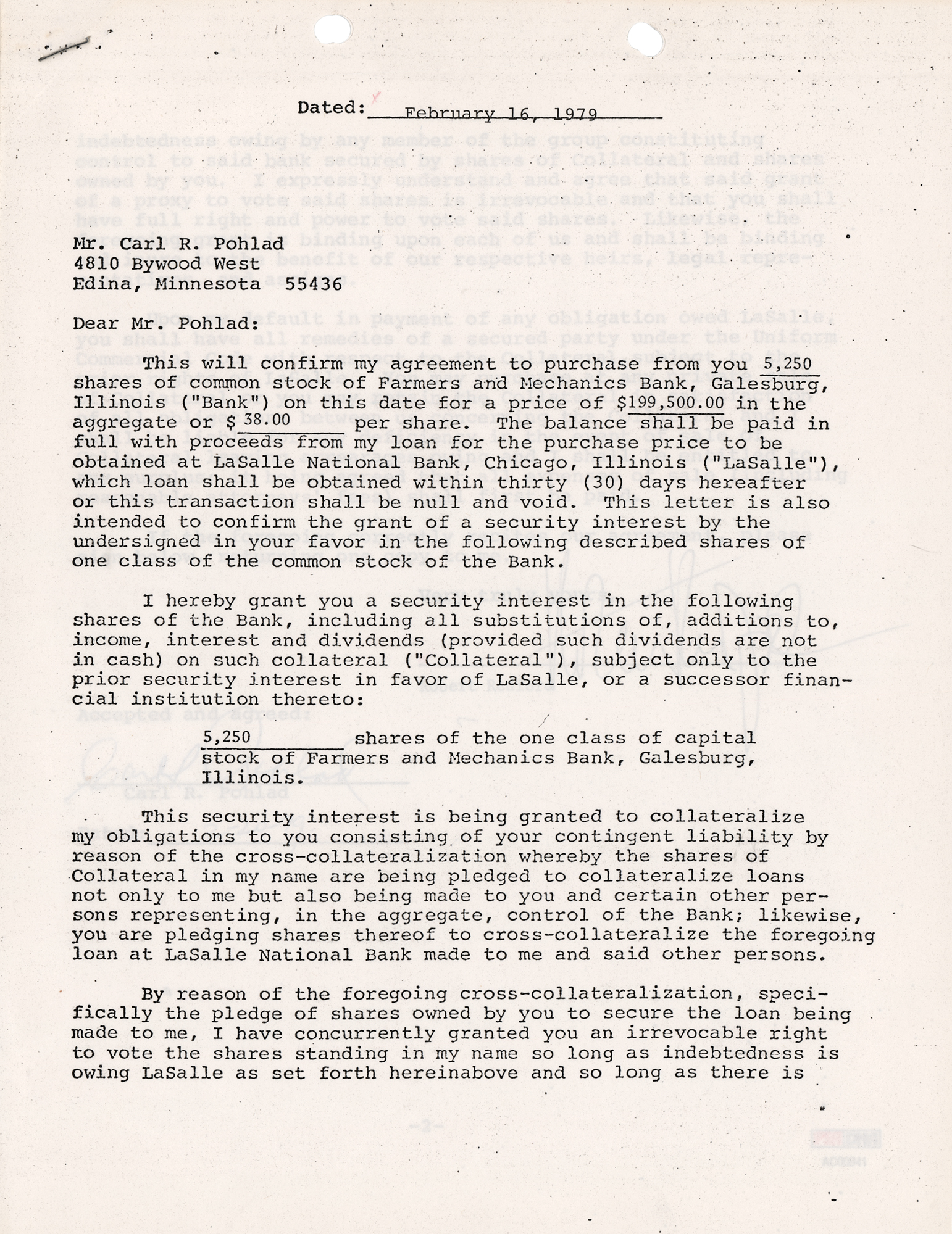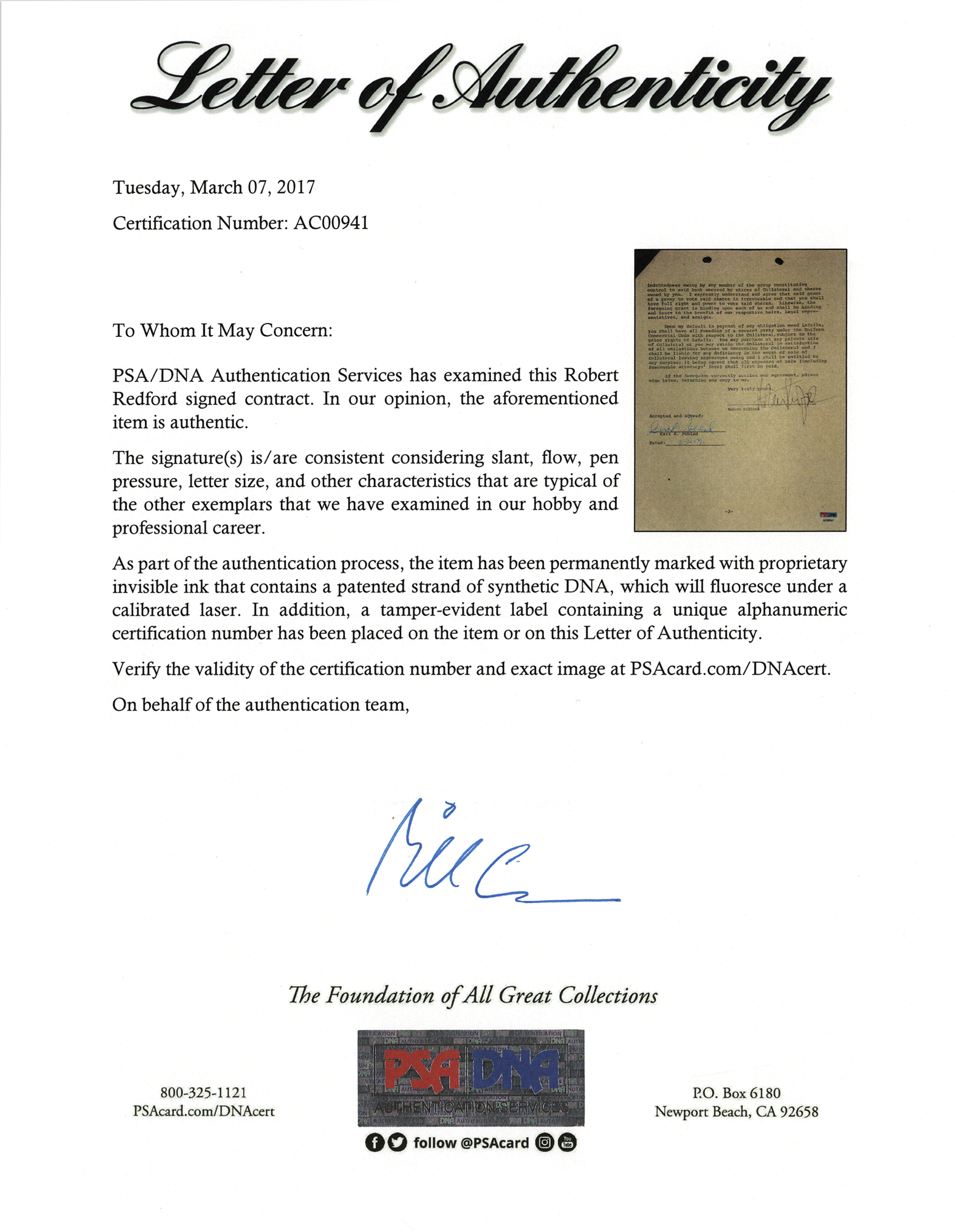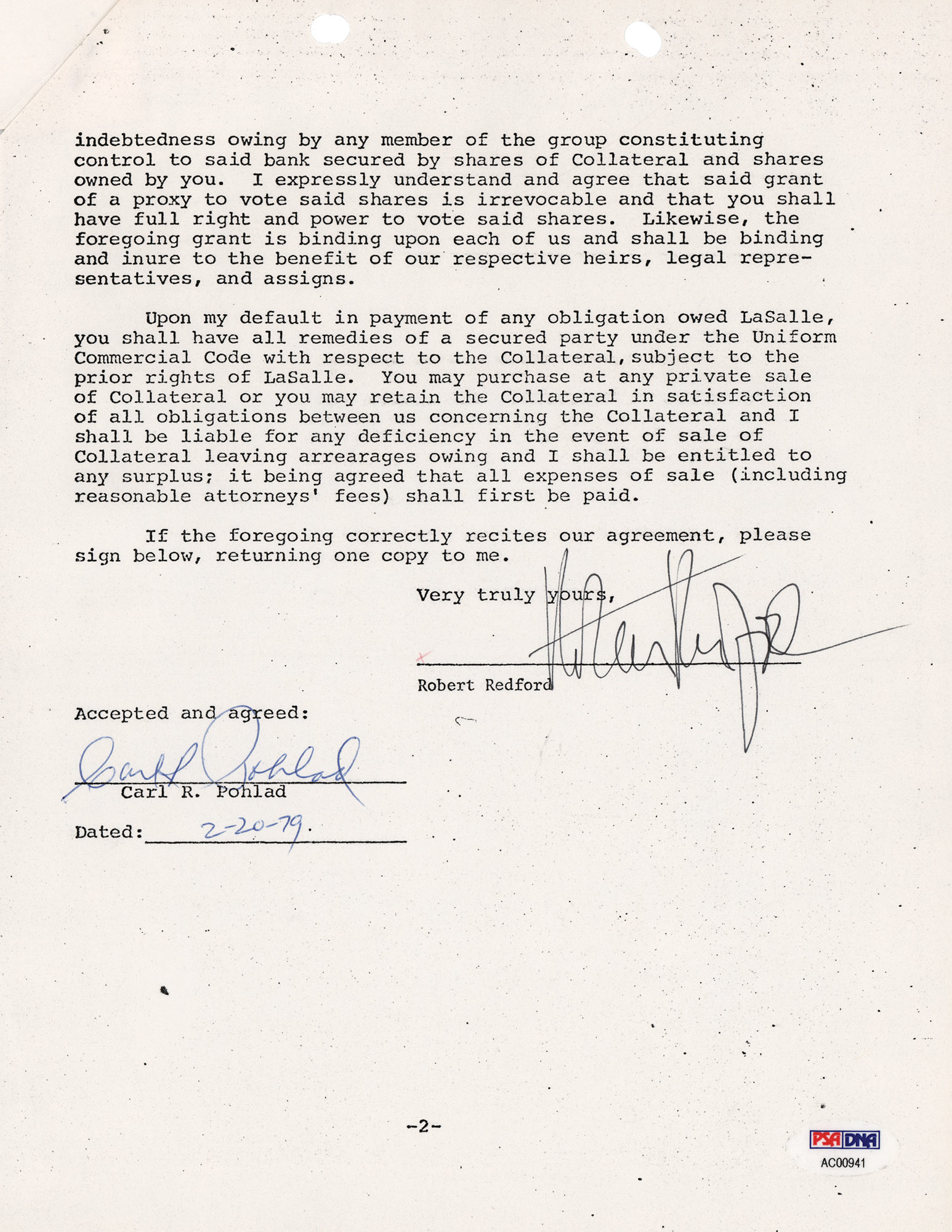 DS, two pages, 8.5 x 11, February 16, 1979. Contract by which Robert Redford confirms an agreement to purchase "5,250 shares of common stock of Farmers and Mechanics Bank, Galesburg, Illinois…for a price of $199,500." Signed at the conclusion in ink by Robert Redford, and countersigned by the seller. In fine condition, with a PSA/DNA label affixed to the lower right. Accompanied by a full letter of authenticity from PSA/DNA.