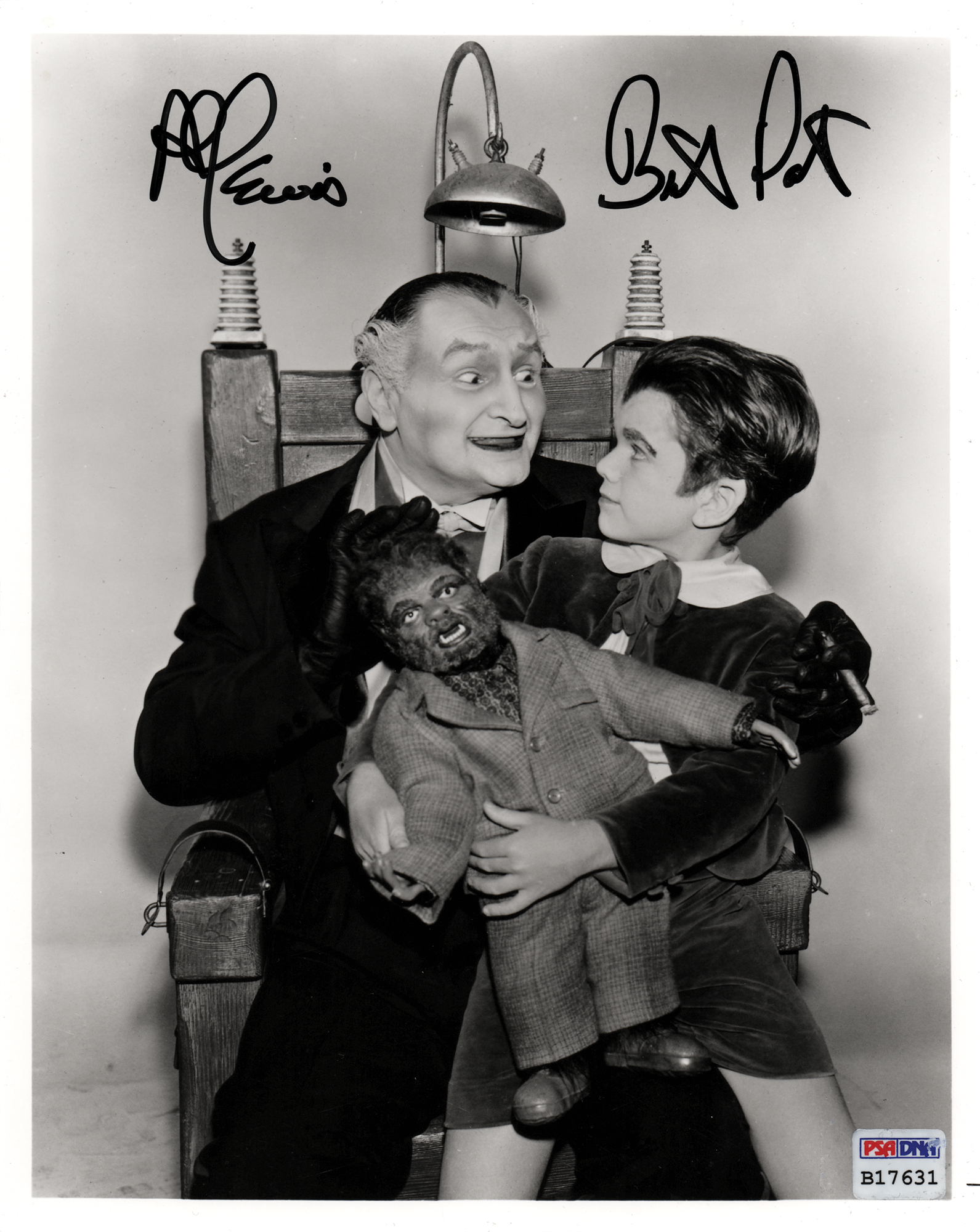 Glossy 8 x 10 photo of Grandpa Munster and Eddie Munster, signed in black felt tip by Al Lewis and Butch Patrick. In fine condition, with a PSA/DNA label affixed to the lower right. Accompanied by a full letter of authenticity from PSA/DNA.