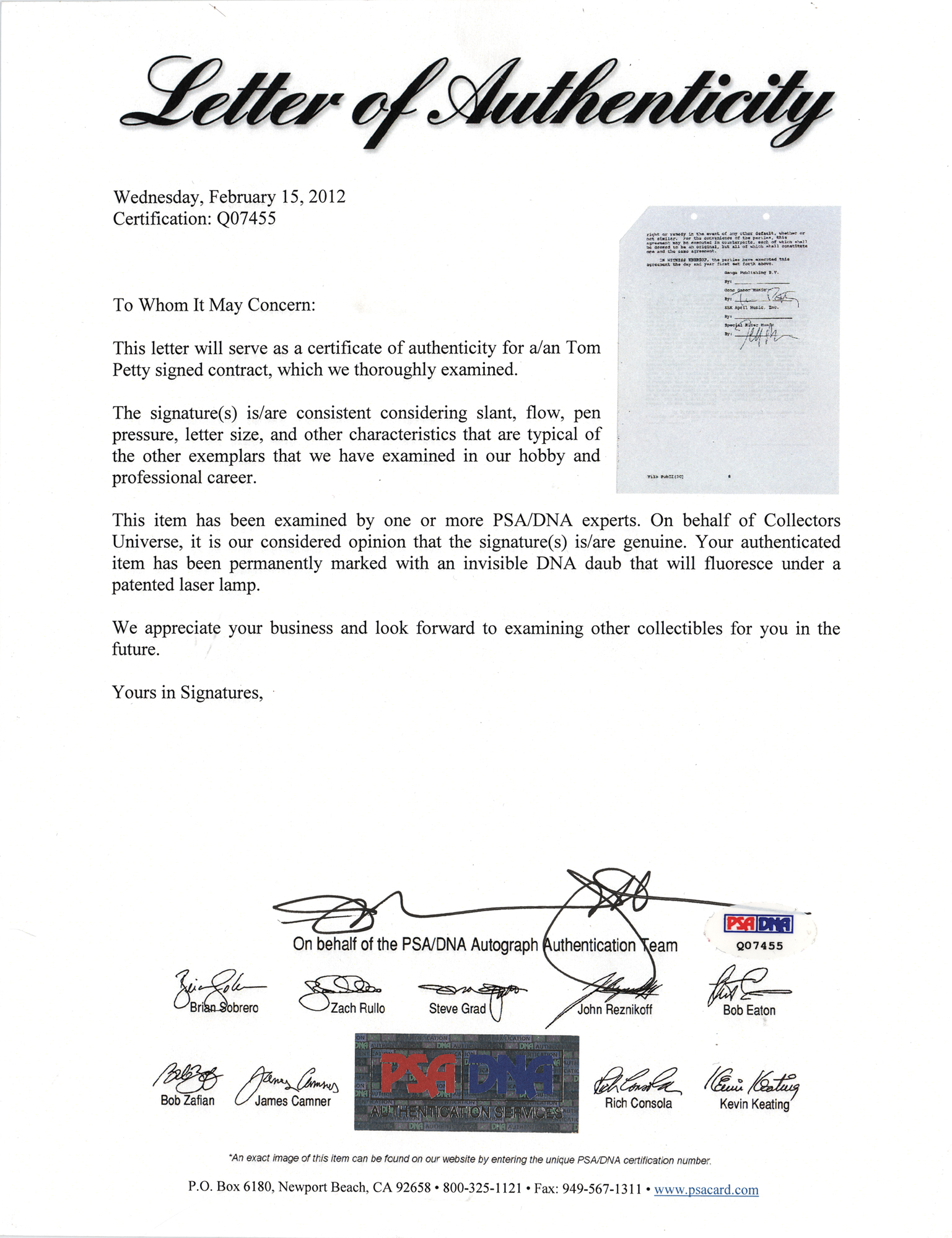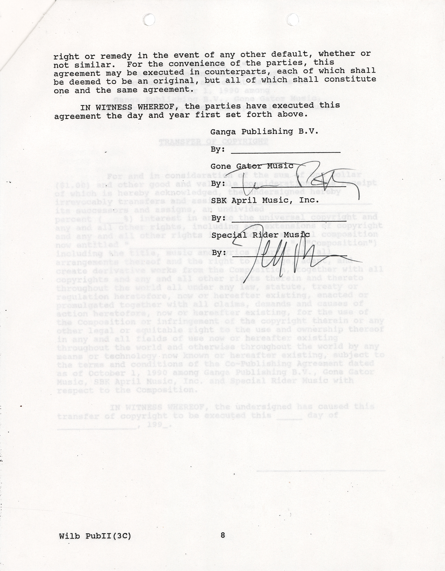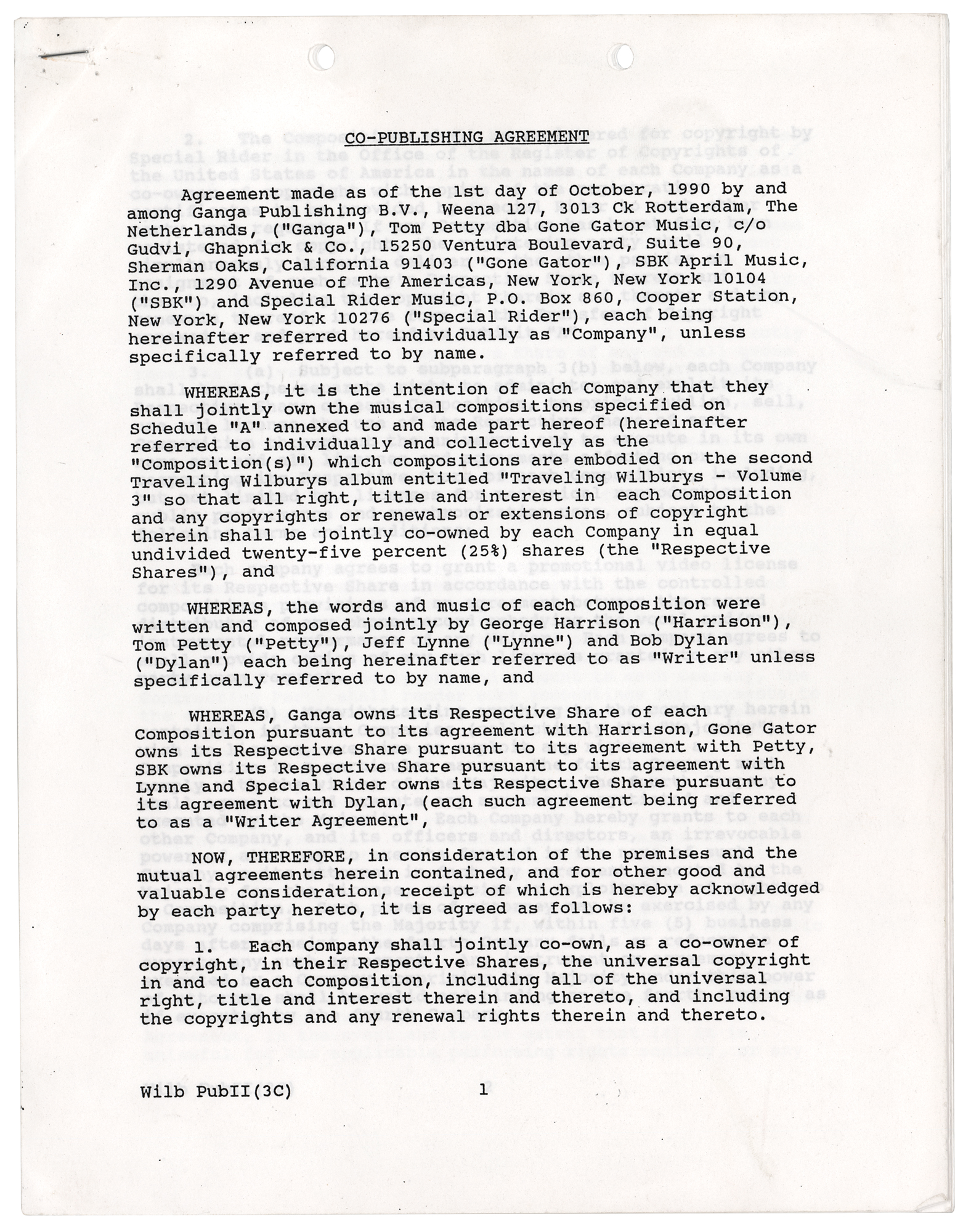 DS, ten pages, 8.5 x 11, October 1, 1990. Co-publishing agreement between Ganga Publishing and Tom Petty pertaining to "the musical compositions specified on Schedule 'A'…which compositions are embodied on the second Traveling Wilburys album entitled 'Traveling Wilburys - Volume 3'…the words and music of each Composition were written and composed jointly by George Harrision…Tom Petty…Jeff Lynne…and Bob Dylan," outlining the terms of their shared ownership of the collaborative works. Schedule A, attached, lists the eleven songs on the album, including "She's My Baby," "Inside Out," "It You Belonged to Me," "Cool Dry Place," and "Wilbury Twist." Signed at the conclusion in black felt tip by Tom Petty and countersigned by Bob Dylan's manager, Jeff Rosen. In fine condition. Accompanied by a full letter of authenticity from PSA/DNA.