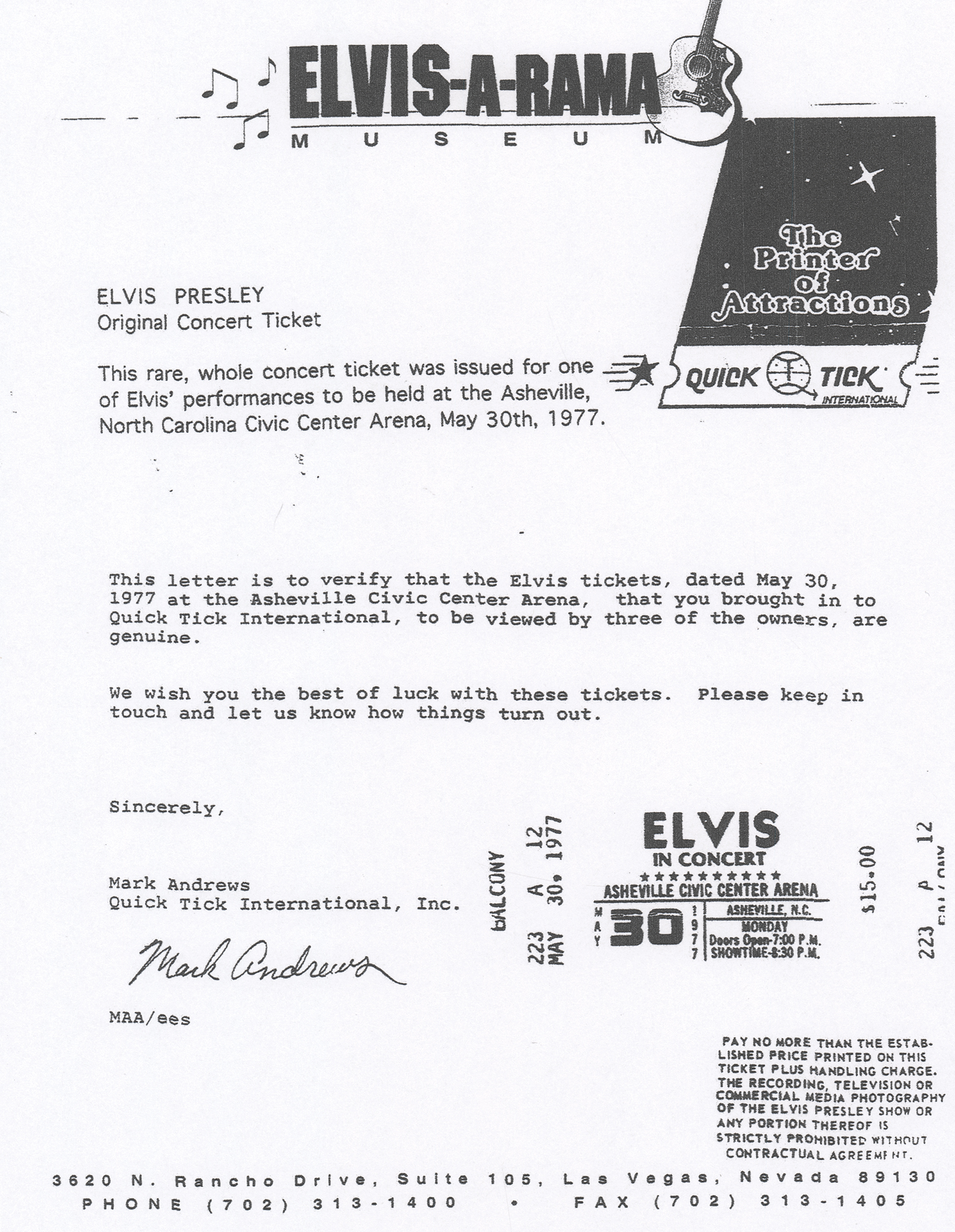 The Asheville concert was canceled due to a scheduling conflict and Presley performed in Jacksonville, Florida, on this date. Elvis was rescheduled to perform in Asheville later in 1977, but he passed away before the concert could come to fruition.