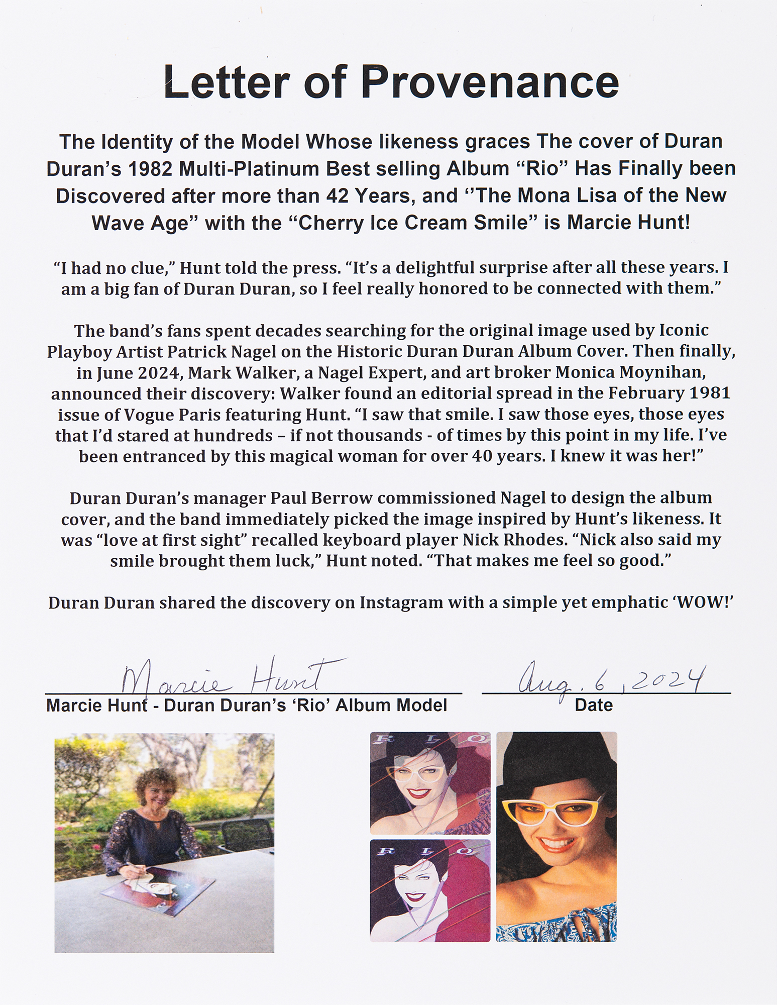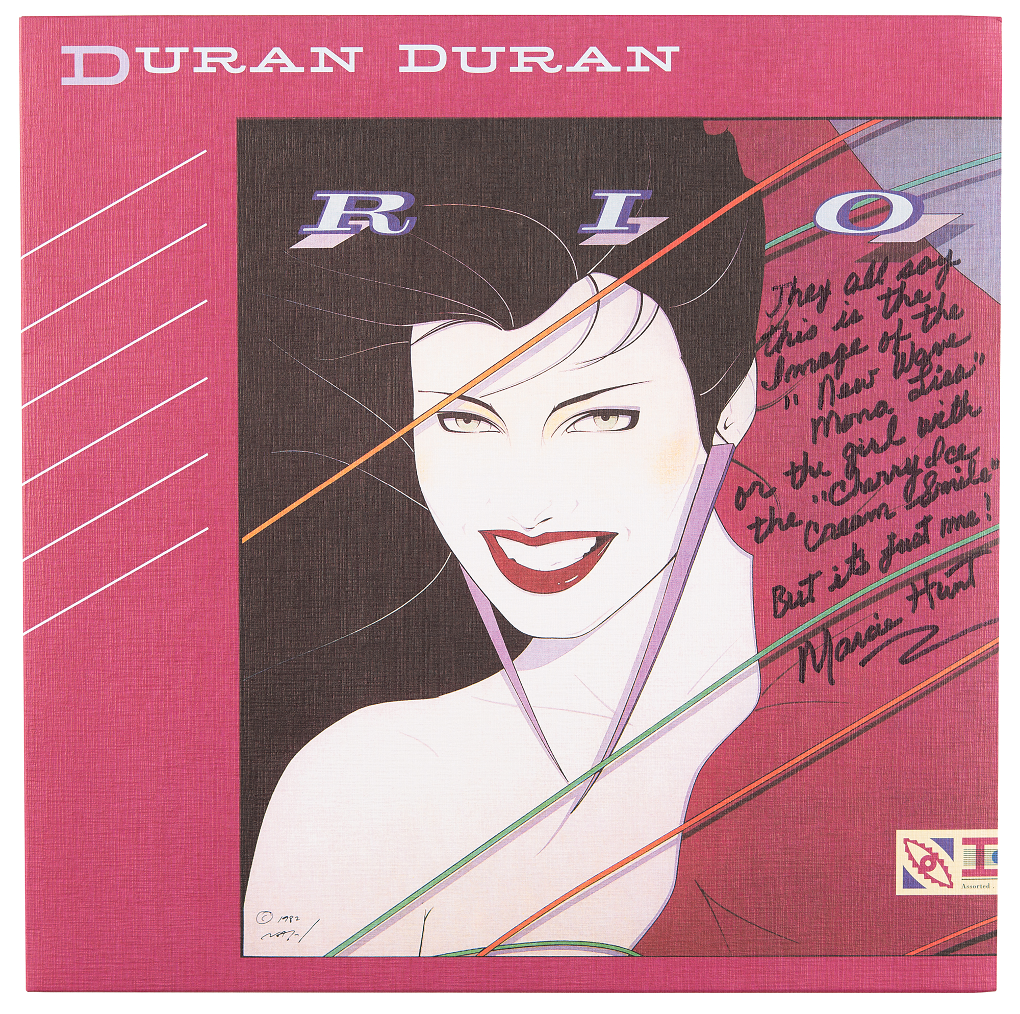 Rio album signed on the front cover in black felt tip, "They all say this is the image of the 'New Wave Mona Lisa,' or the girl with the 'Cherry Ice Cream Smile,' but it's just me! Marcie Hunt." In very fine condition. The record is included.