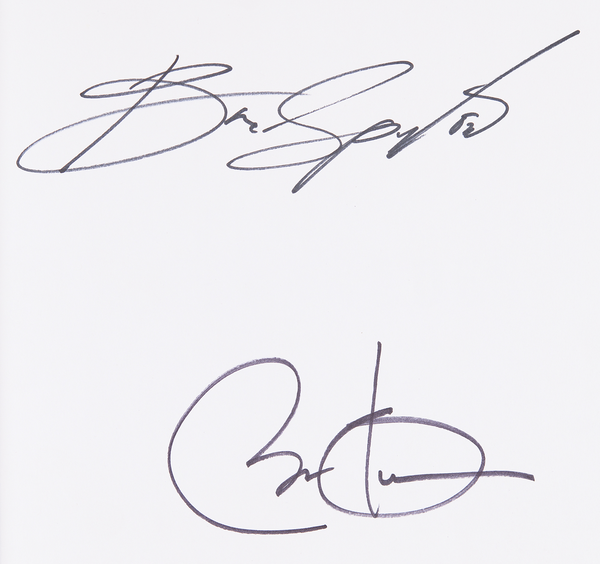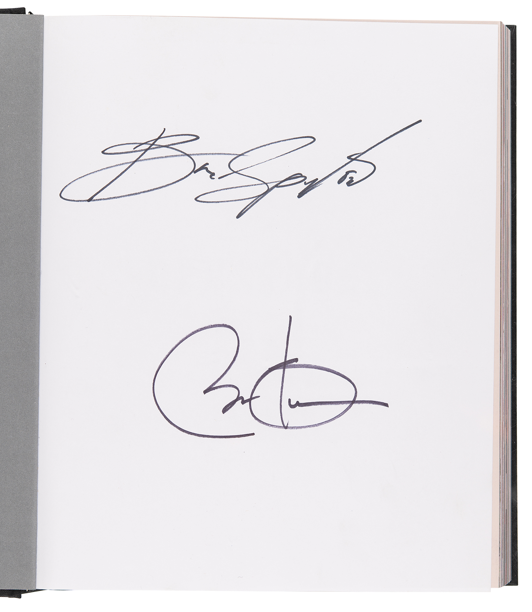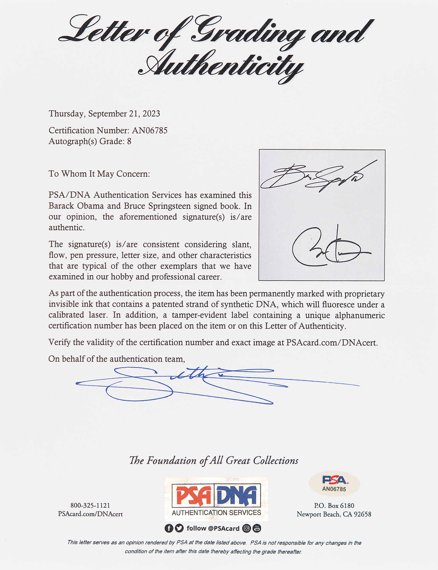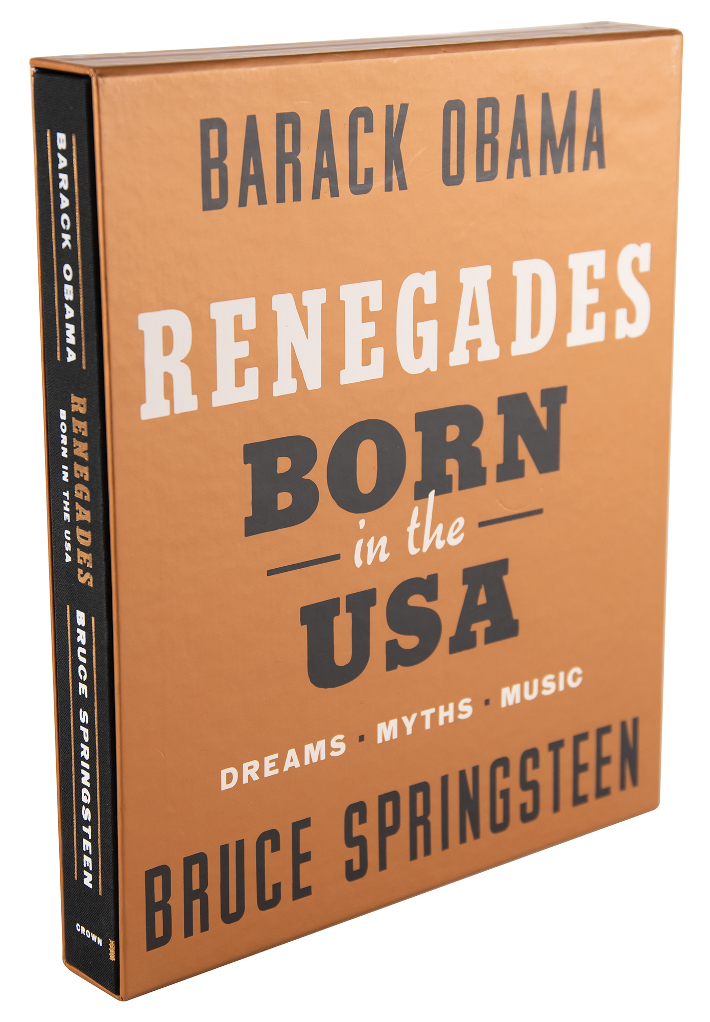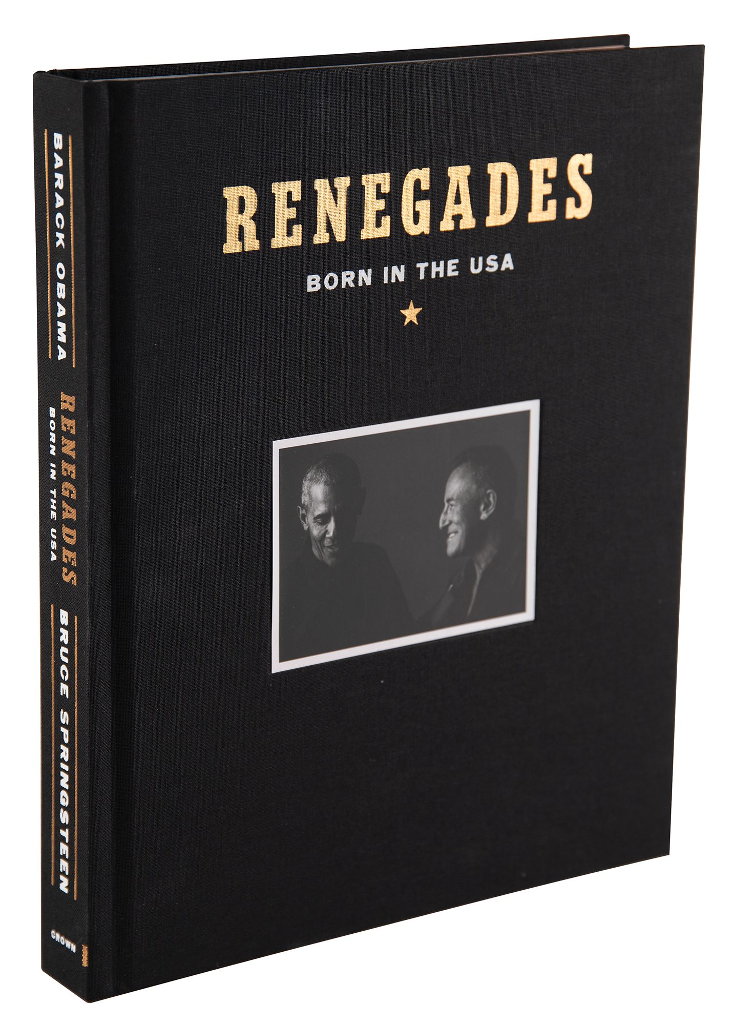 Signed book: Renegades: Born in the USA. Deluxe first edition. NY: Crown Publishing, 2021. Hardcover with slipcase, 9.5 x 11.5, 303 pages. Signed prominently on an opening page in black felt tip by Barack Obama and Bruce Springsteen. In very fine condition. Accompanied by the original shipping box and a full letter of grading and authenticity from PSA/DNA, assigning an autograph grade of "8." A sought-after and beautifully produced expansion of their groundbreaking Higher Ground podcast, featuring more than 350 photographs, exclusive bonus content, and never-before-seen archival material.