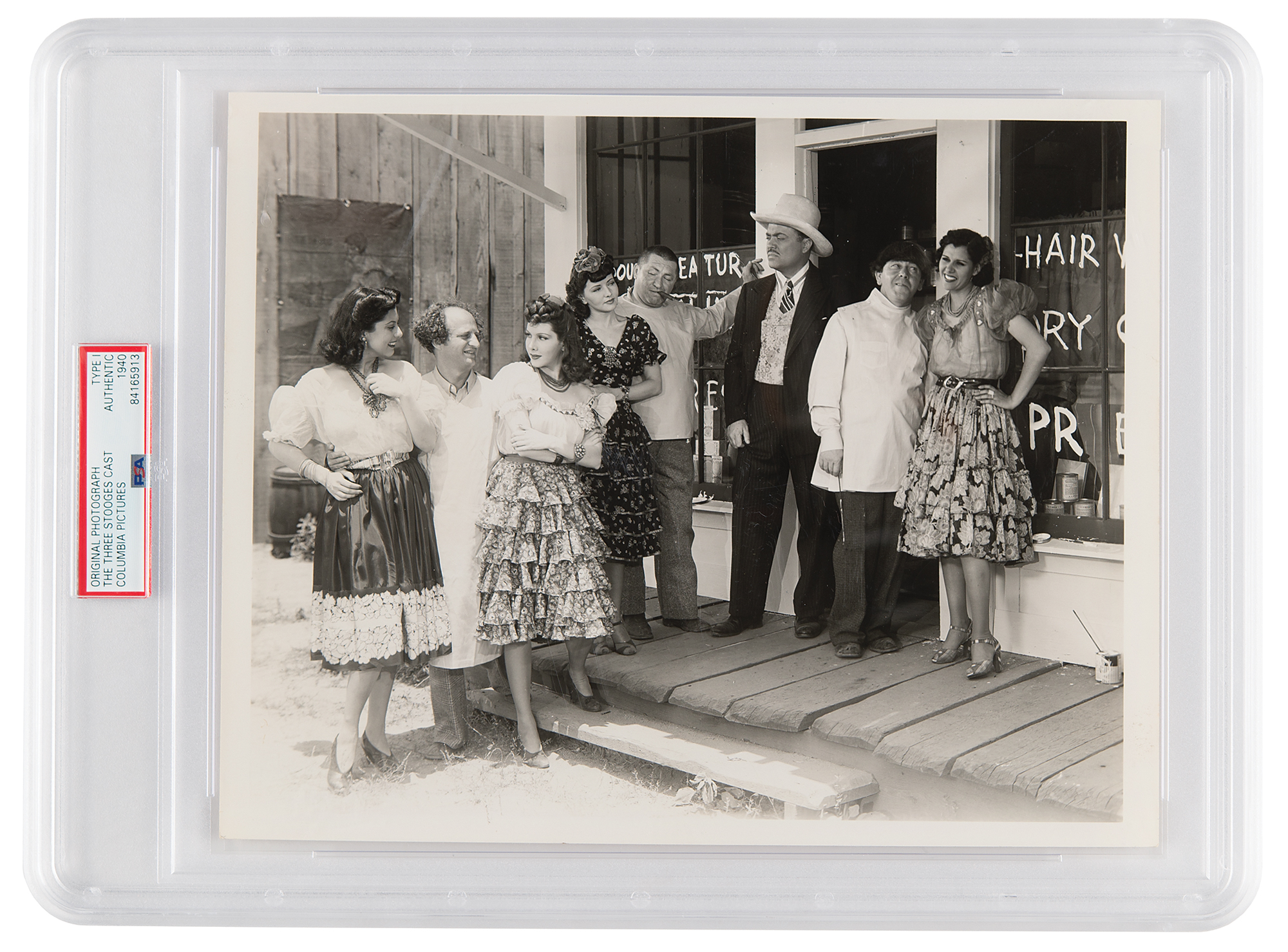 Original glossy 10 x 8 still photograph of a scene from the Three Stooges short ‘Cookoo Cavaliers,’ which was released by Columbia Pictures on November 15, 1940. The photo shows Moe, Larry, and Curly posing with several pretty senoritas outside of their beauty salon in the tranquil village of Cucaracha, Mexico. The reverse is annotated in pencil, “From the Personal Collection of Moe Howard,” and bears an affixed warning label that states: “This photograph is an original print from Moe Howard’s private collection.” In fine condition. Encapsulated in a PSA/DNA authentication holder, identifying it as an authentic "Type I" photograph. Accompanied by a full letter of authenticity from PSA/DNA.