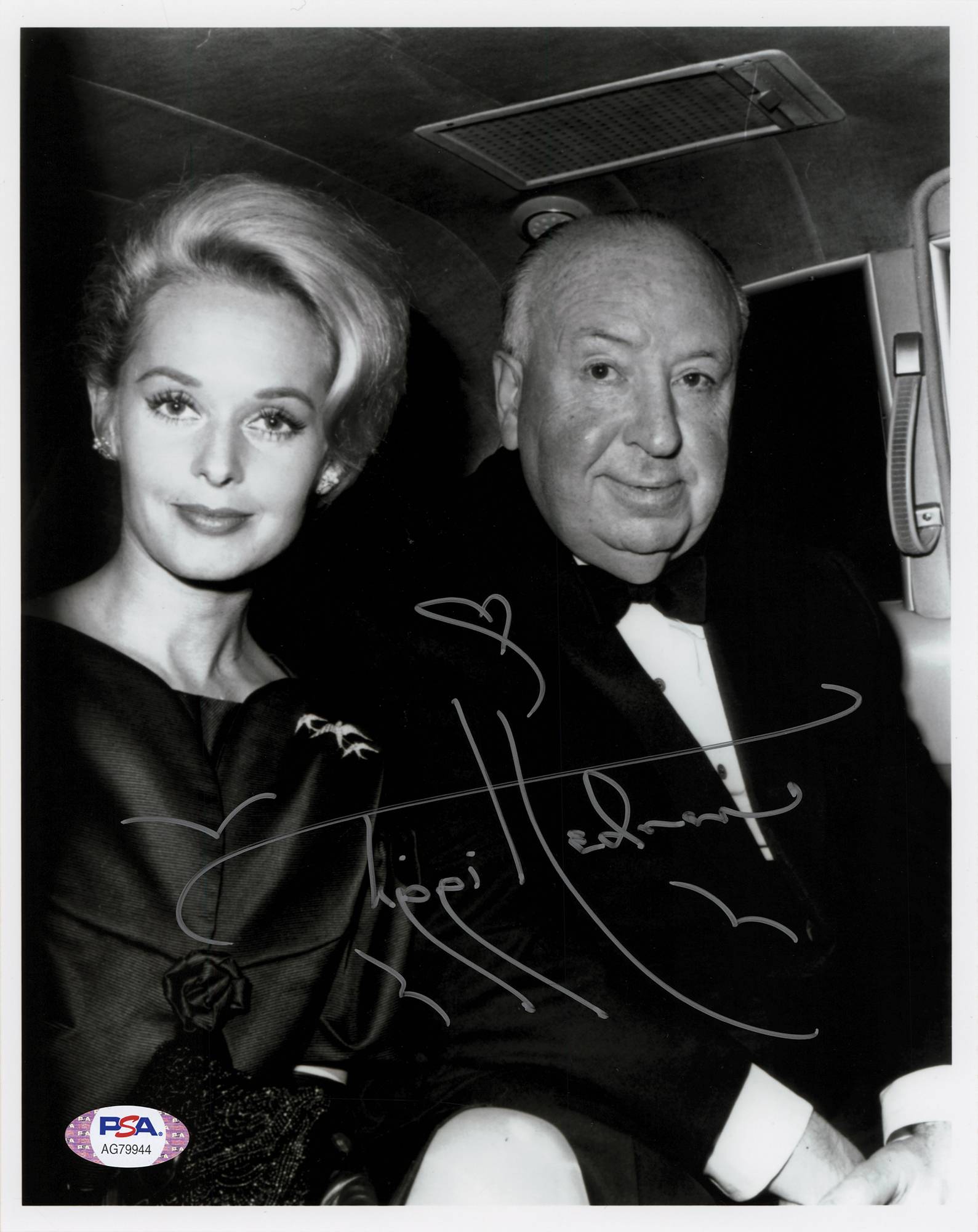 Glossy 8 x 10 photo of Tippi Hedren with legendary director Alfred Hitchcock, signed in silver felt tip by the actress, who sketches a few birds. In very fine condition, a PSA/DNA label affixed to the lower corner. Accompanied by a certificate of authenticity from PSA/DNA.