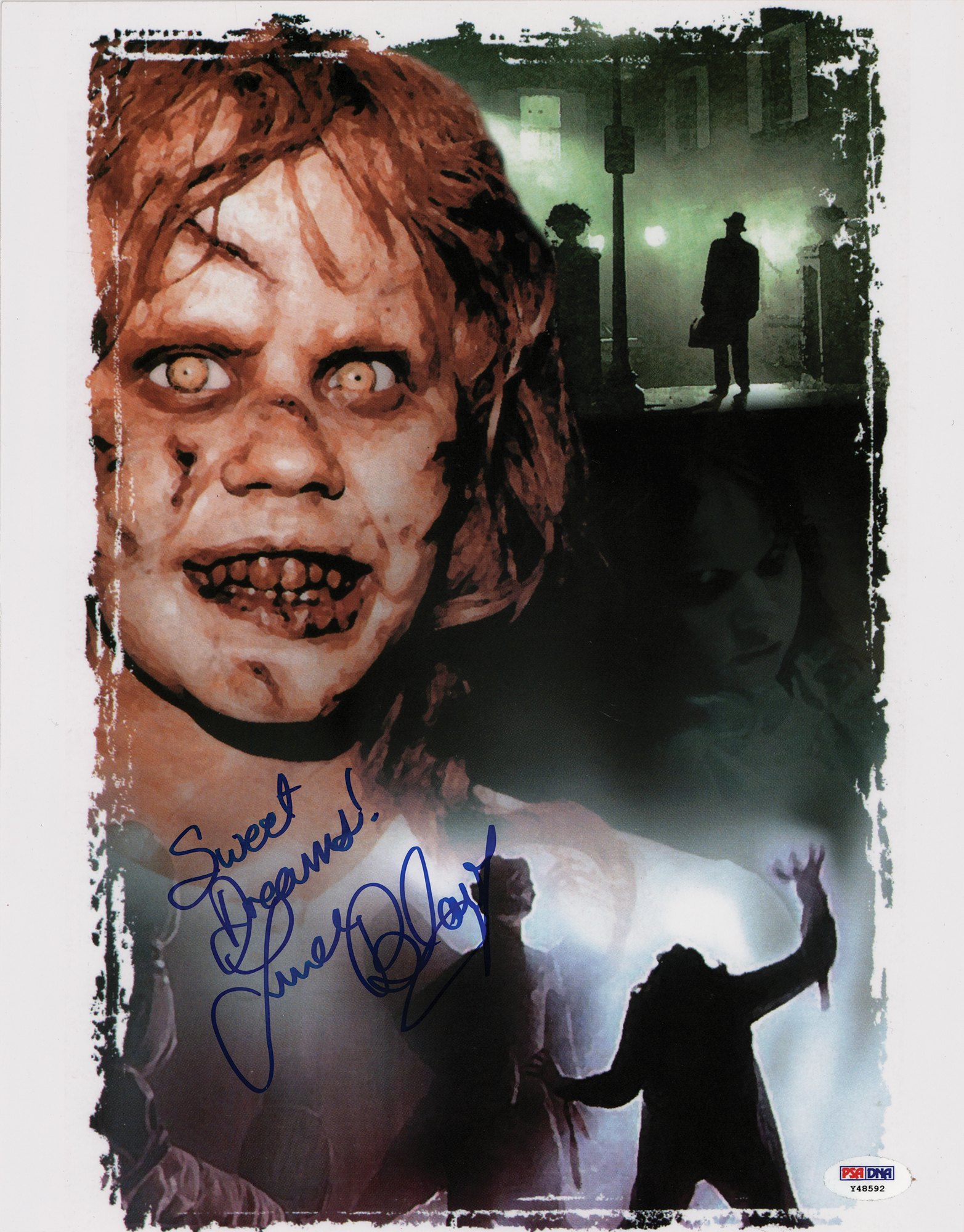 Color glossy 11 x 14 photo from The Exorcist, signed in blue felt tip, "Sweet Dreams! Linda Blair." In very fine condition, with a PSA/DNA label affixed to the lower right corner. Accompanied by a certificate of authenticity from PSA/DNA.