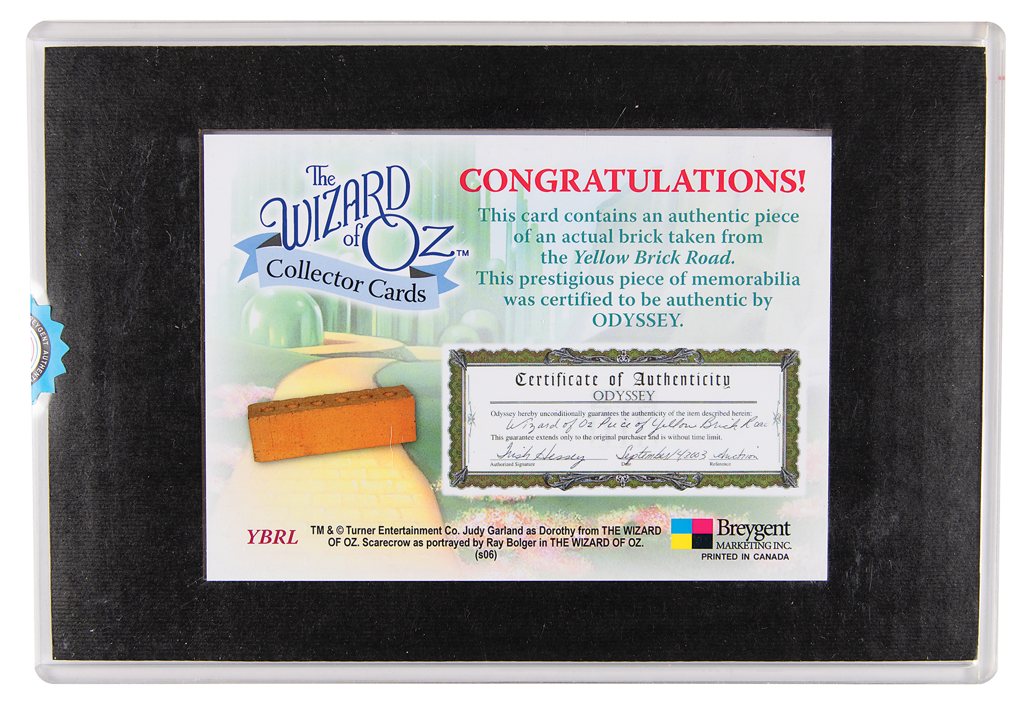 Limited edition 5 x 7 card featuring "an authentic piece of an actual brick taken from the Yellow Brick Road," numbered 157/200, signed in black felt tip, "Jerry Maren, 'Lollypop Kid.'" Prepared by Breygent Marketing, Inc., illustrating the origin of the brick (an Odyssey auction) on the reverse. In fine condition.