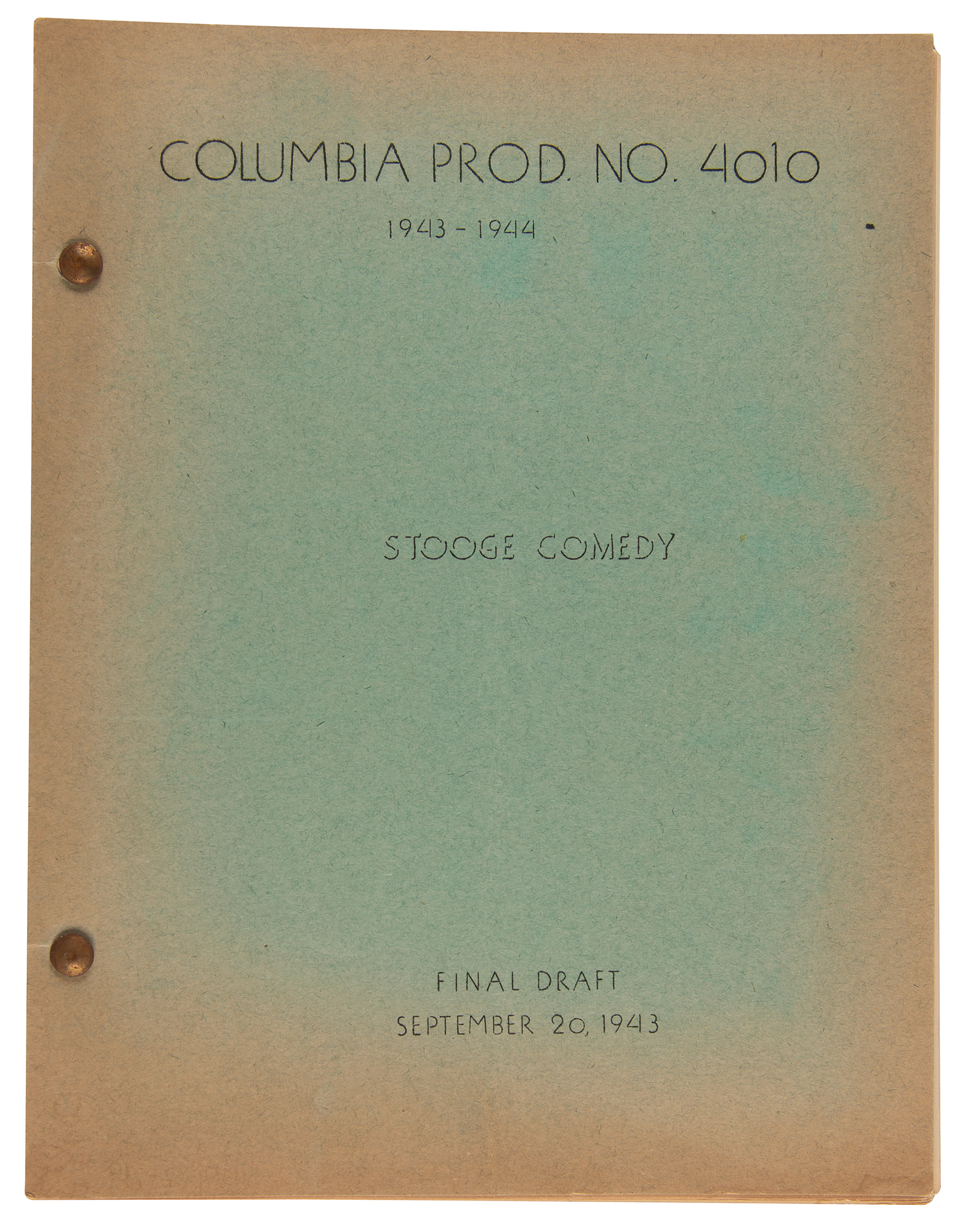 Moe Howard's personally-owned final draft continuity script for "Columbia Prod. No. 4010, 'Crash Goes the Hash!,'" 28 pages, 8.5 x 11, September 20, 1943. The brad-bound script by Felix Adler features pale green Columbia covers secured by two brads. In fine condition, with toning to the covers and a light central vertical fold. Accompanied by a certificate of authenticity from Nate D. Sanders, attributing the script to the estate of Moe Howard.