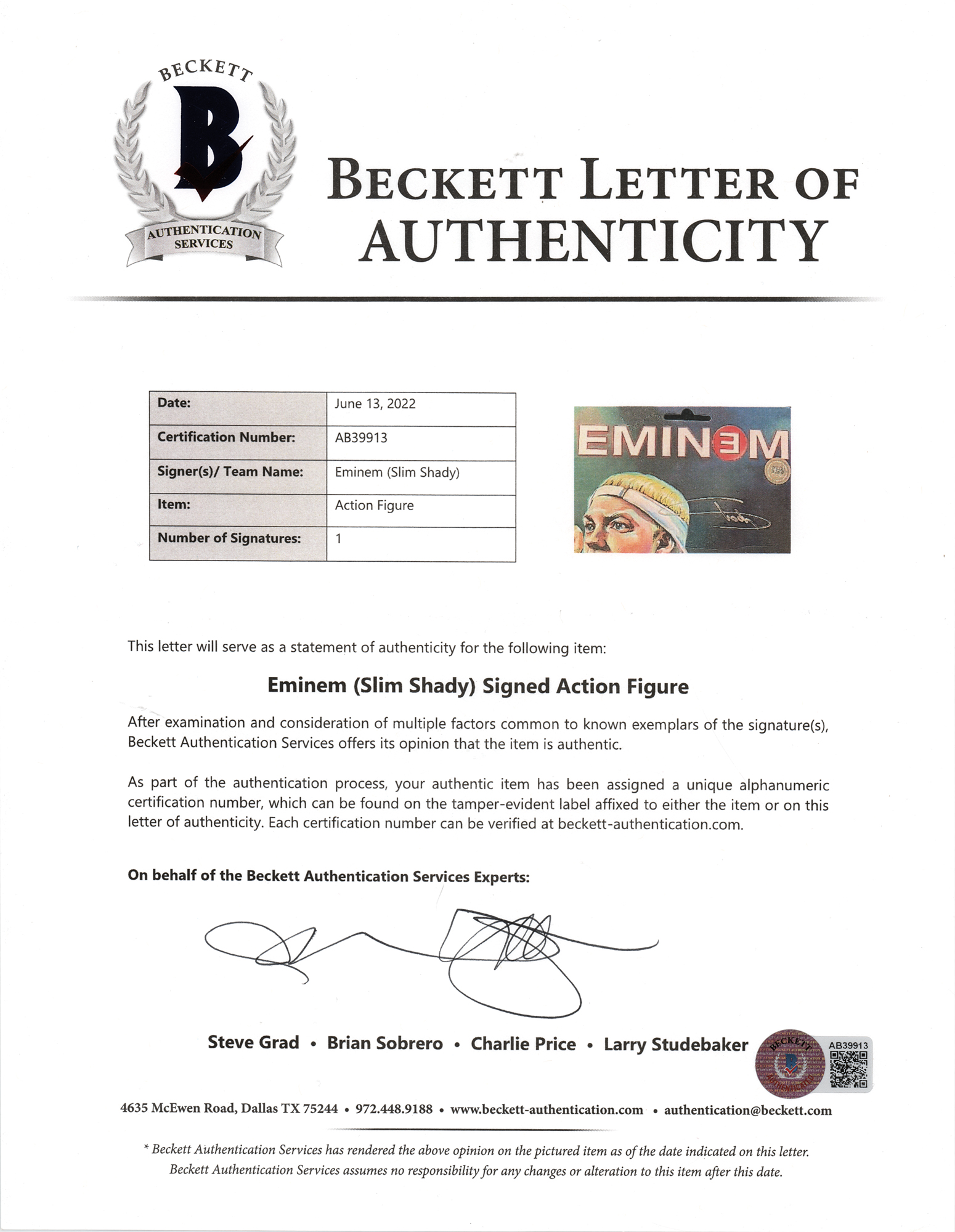 Sealed 'Shady Con Exclusive' Slim Shady action figure, new in its original packaging, featuring Eminem in his classic red shirt and white visor, signed on the packaging in silver ink by the rap icon, "Shady." In very fine condition. Accompanied by a full letter of authenticity from Beckett Authentication Services.