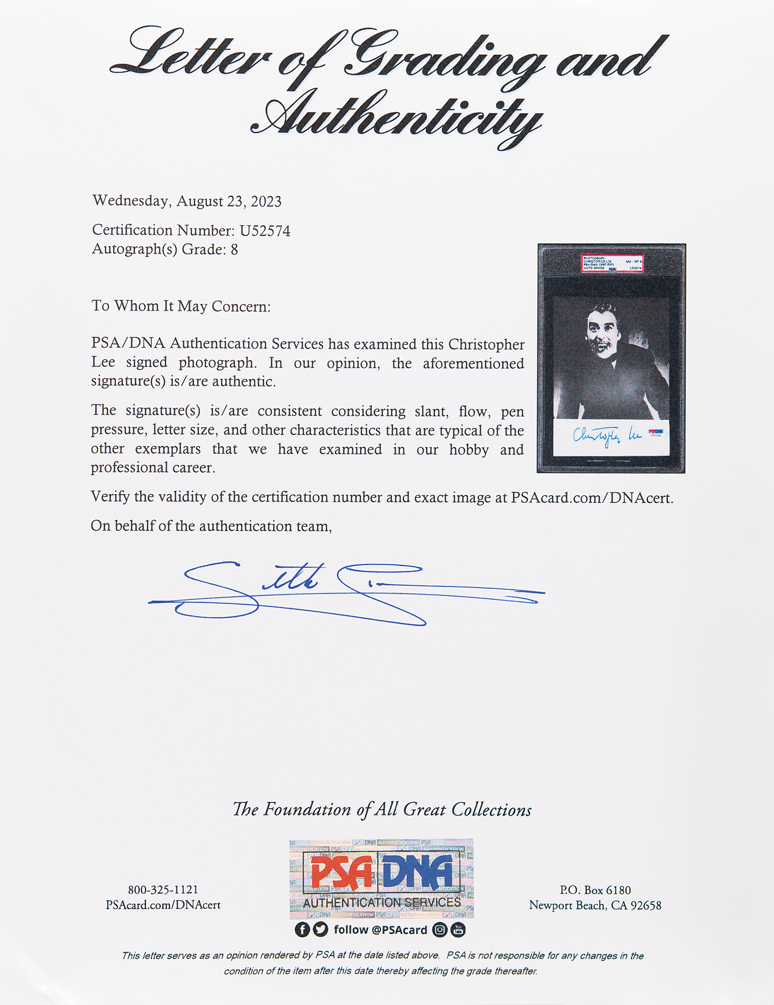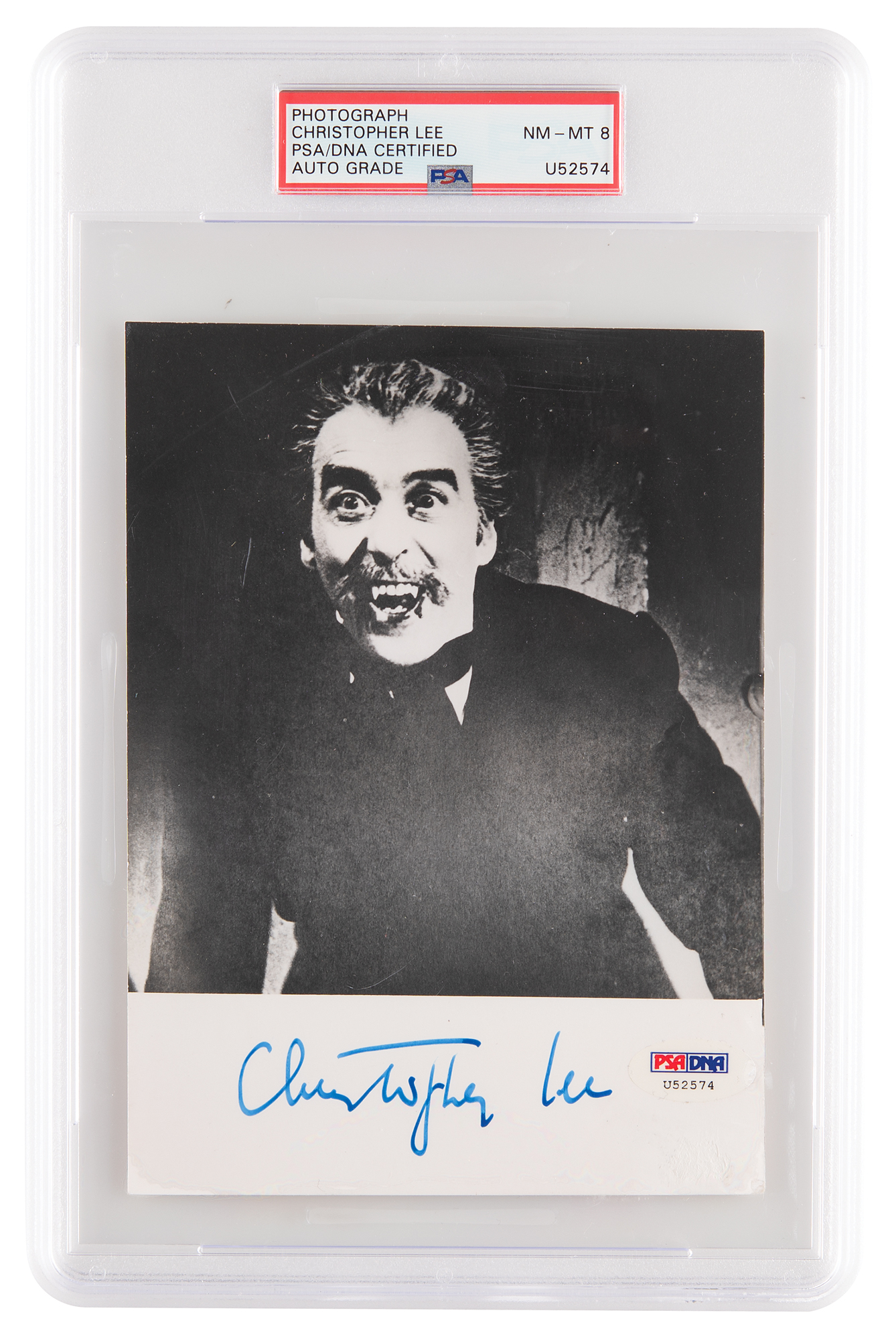Glossy 5 x 7 photo of Christopher Lee as Dracula, signed in the lower border in blue ink. In fine condition, with a PSA/DNA label affixed to the lower corner. Accompanied by a full letter of grading and authenticity from PSA/DNA, and encapsulated and graded as "NM-MT 8."