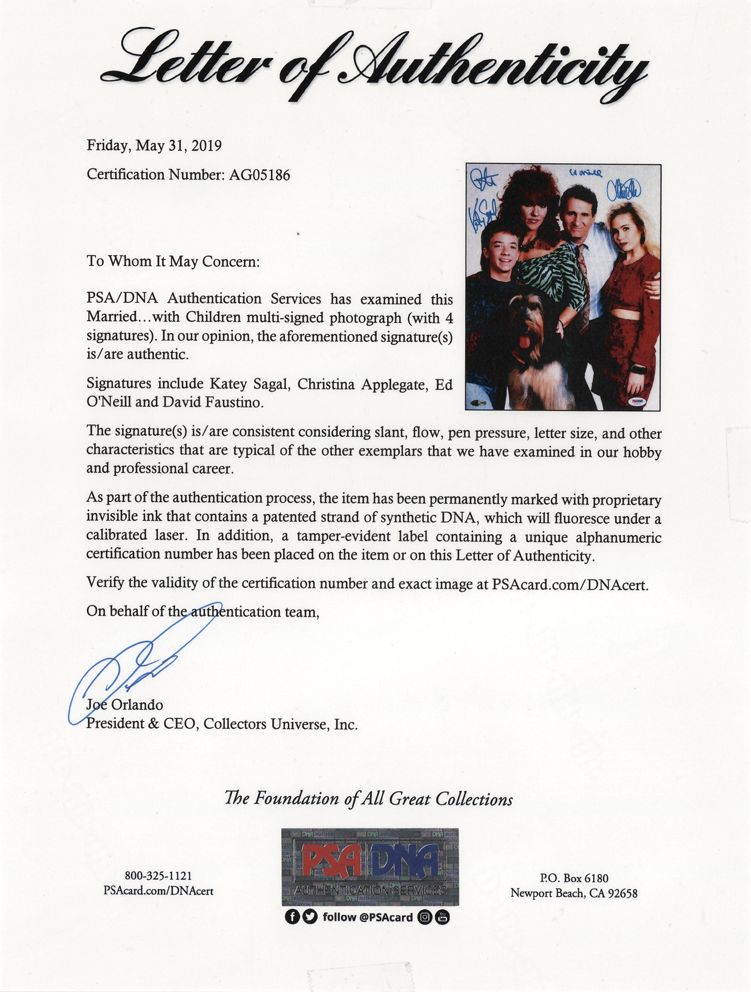 Color satin-finish 11 x 14 photo of the cast of Married… with Children, signed in blue felt tip by Katey Sagal, Christina Applegate, Ed O'Neill, and David Faustino. In very fine condition, with a PSA/DNA label affixed to the lower right corner. Accompanied by a full letter of authenticity from PSA/DNA