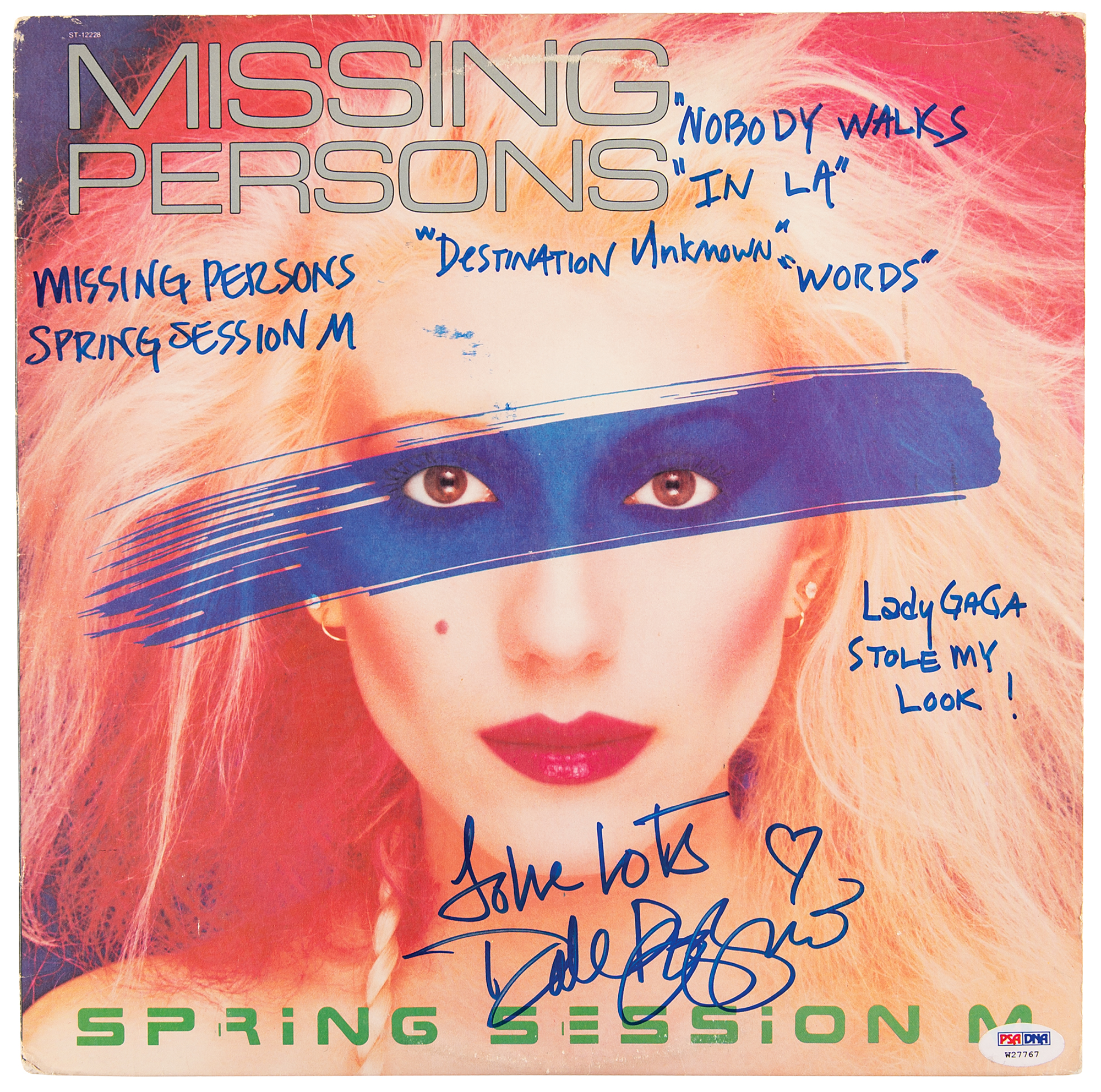 Spring Session M album signed on the front cover in blue felt tip, "Love lots, Dale Bozzio," adding: "Missing Persons, Spring Session M, 'Nobody Walks,' 'In LA,' 'Destination Unknown,' 'Words,' Lady Gaga Stole My Look!" In fine condition. The record is included. Accompanied by a full letter of authenticity from PSA/DNA and two images taken during the signing session.