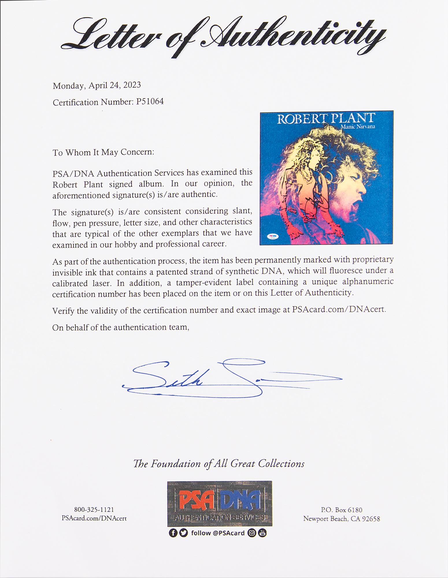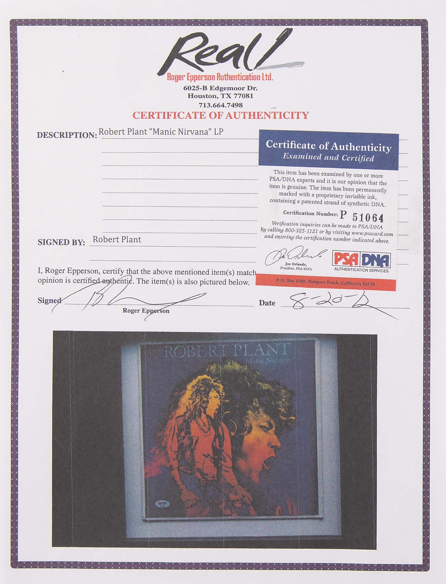 Manic Nirvana album signed on the front cover in black felt tip by Robert Plant. In fine condition, with a PSA/DNA label affixed to the lower left. The record is included. Accompanied by a full letter of authenticity from PSA/DNA.