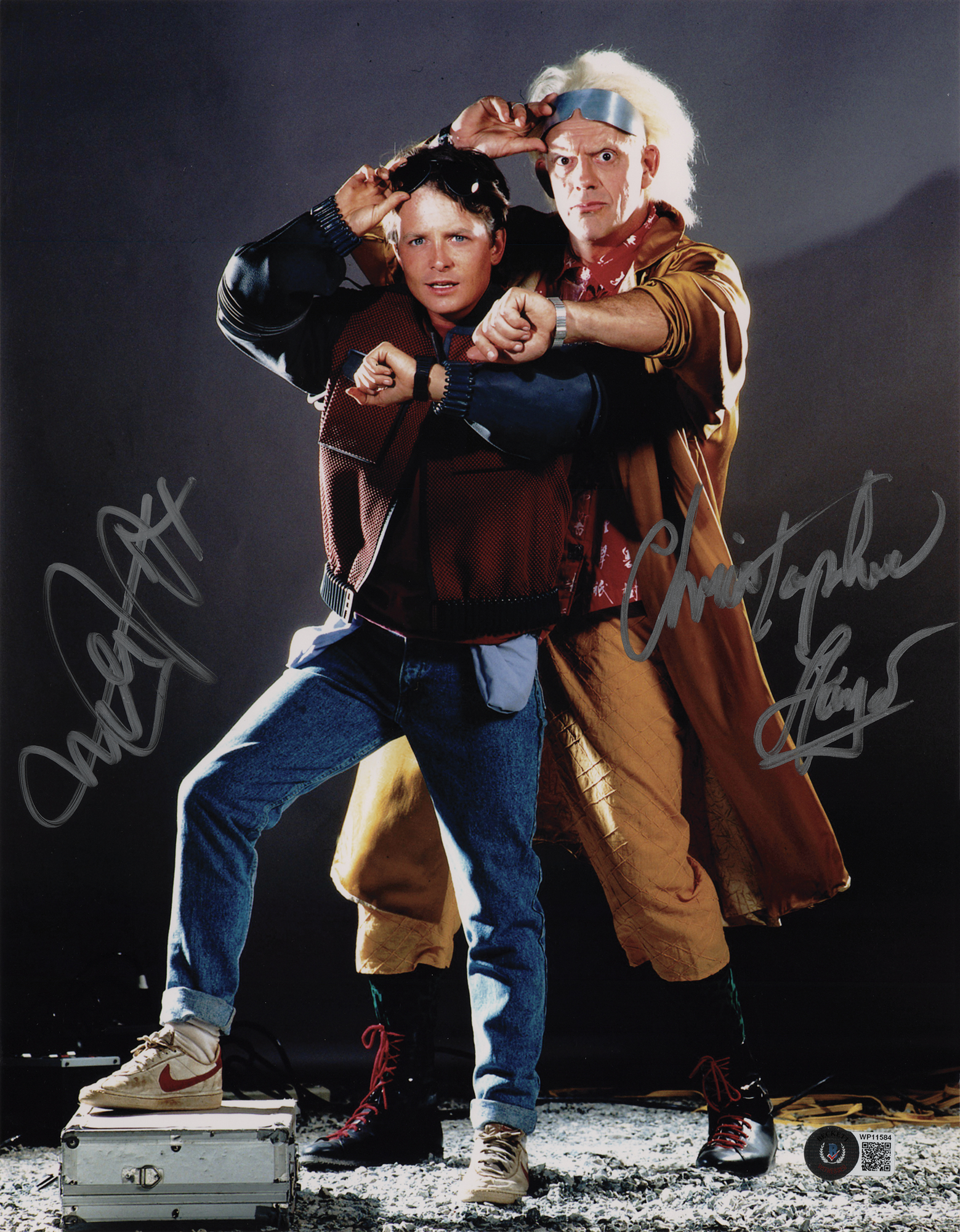 Desirable color satin-finish 11 x 14 photo from Back to the Future, signed in silver ink by Michael J. Fox and Christopher Lloyd. In fine condition, with a Beckett label affixed to the lower right corner.