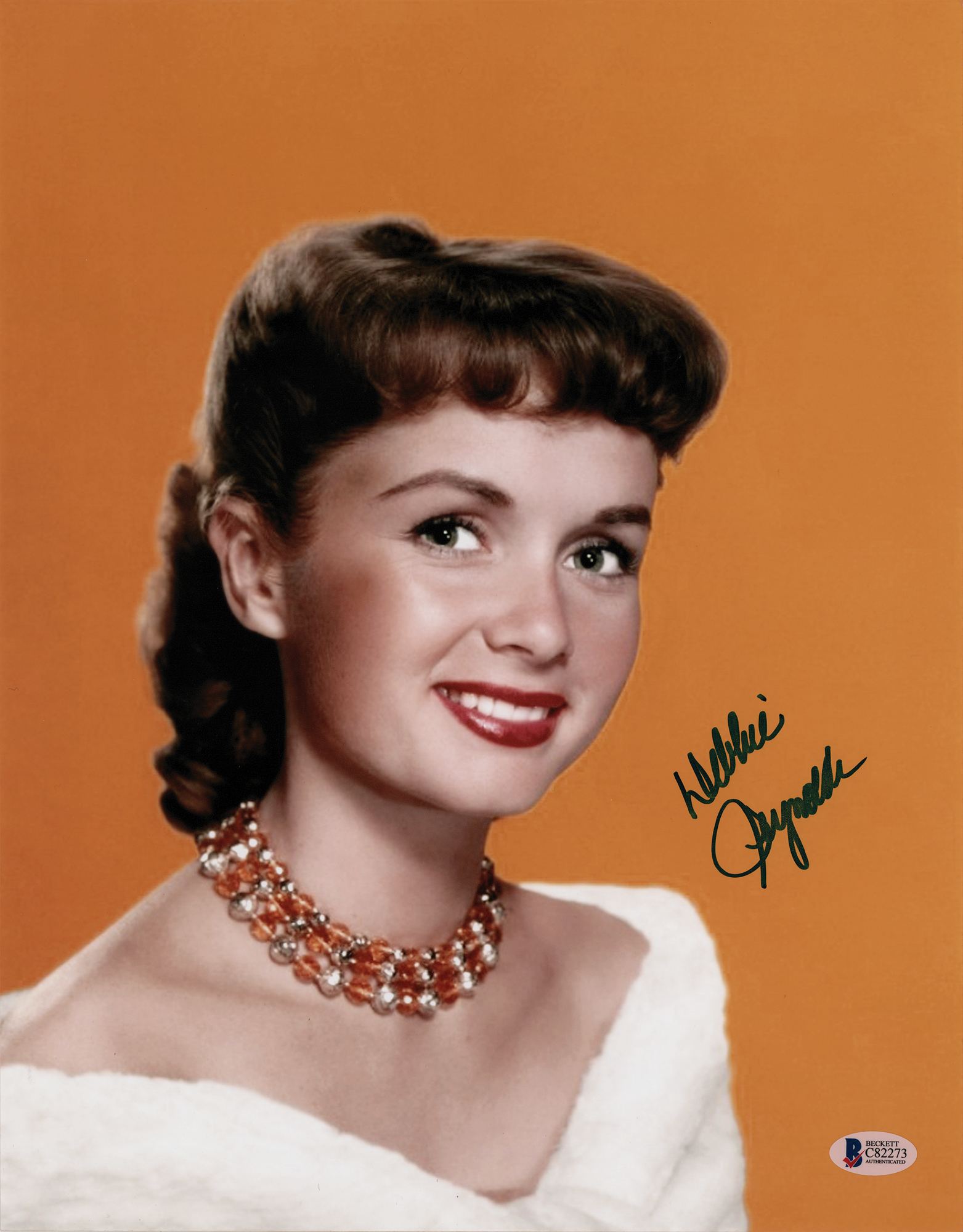 Color satin-finish 11 x 14 head-and-shoulders photo of Debbie Reynolds wearing a chunky necklace, signed in blue felt tip. In very fine condition, with a Beckett label affixed to the lower right corner. Accompanied by a certificate of authenticity from Beckett Authentication Services.
