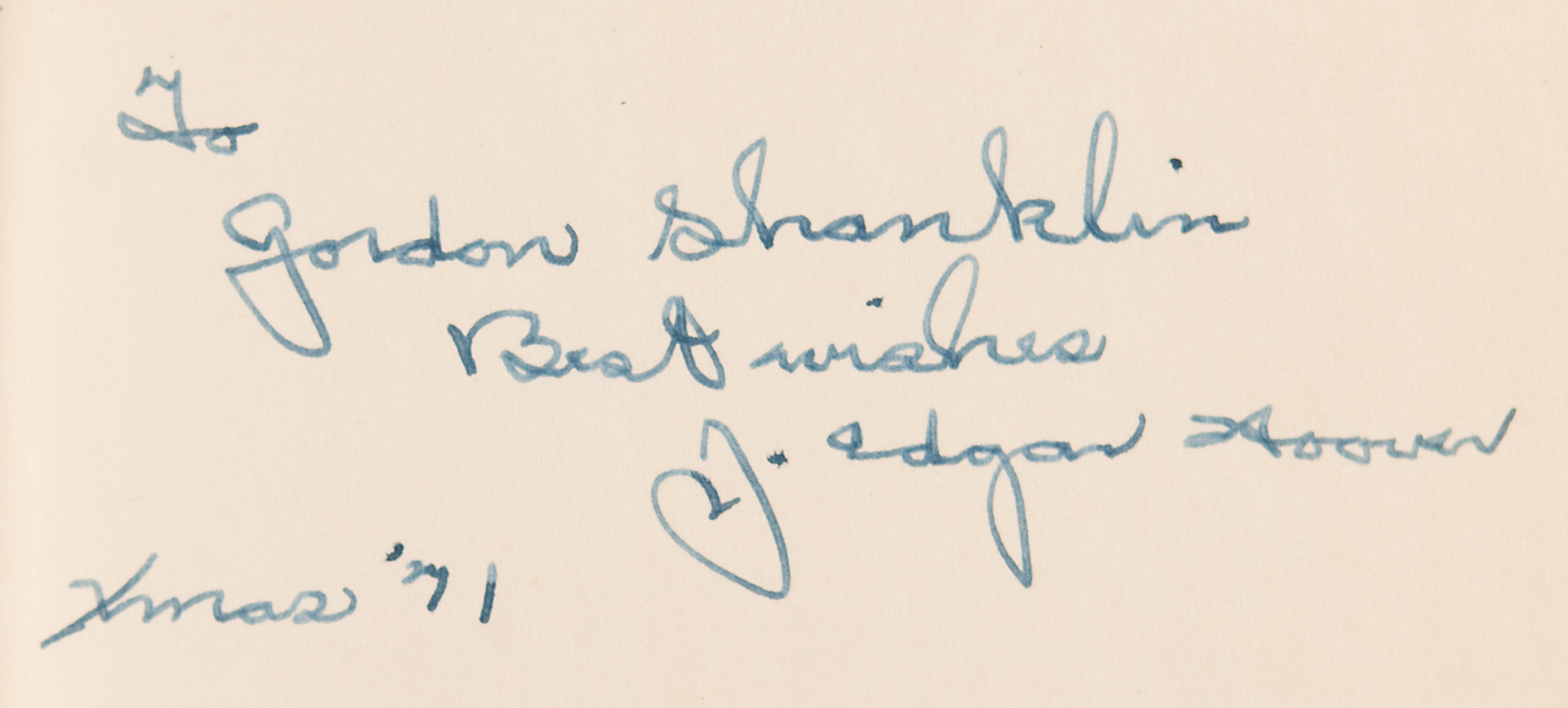 Signed book: Attack on Terror: The FBI Against the Ku Klux Klan in Mississippi by Don Whitehead. First edition. NY: Funk & Wagnalls, 1970. Hardcover with dust jacket, 5.75 x 8.5, 321 pages. Signed and inscribed on the first free end page in black ink, “To Gordon Shanklin, Best wishes, J. Edgar Hoover, Xmas ‘71.” In fine condition.