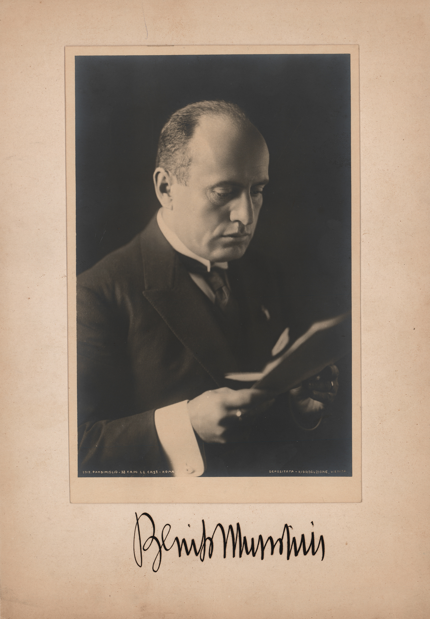 Vintage matte-finish 5.75 x 8.75 portrait photo of Mussolini by the Pandimiglio Studio of Rome, affixed to the original 8.5 x 12 mount, which is signed prominently in bold black ink, "Benito Mussolini.” In fine condition, with the photo partially detached from the mount, but easily reattached. A superb uninscribed portrait of the Italian dictator.