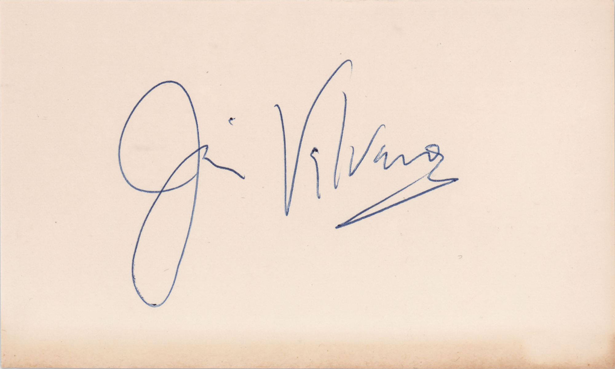 Inspirational college basketball coach (1946–1993) remembered for running up and down the court after winning the 1983 NCAA championship, seemingly in disbelief and looking for someone to hug. Ballpoint signature, "Jim Valvano,” on an off-white 5 x 3 card. In fine condition, with a thin strip of toning along the bottom edge.