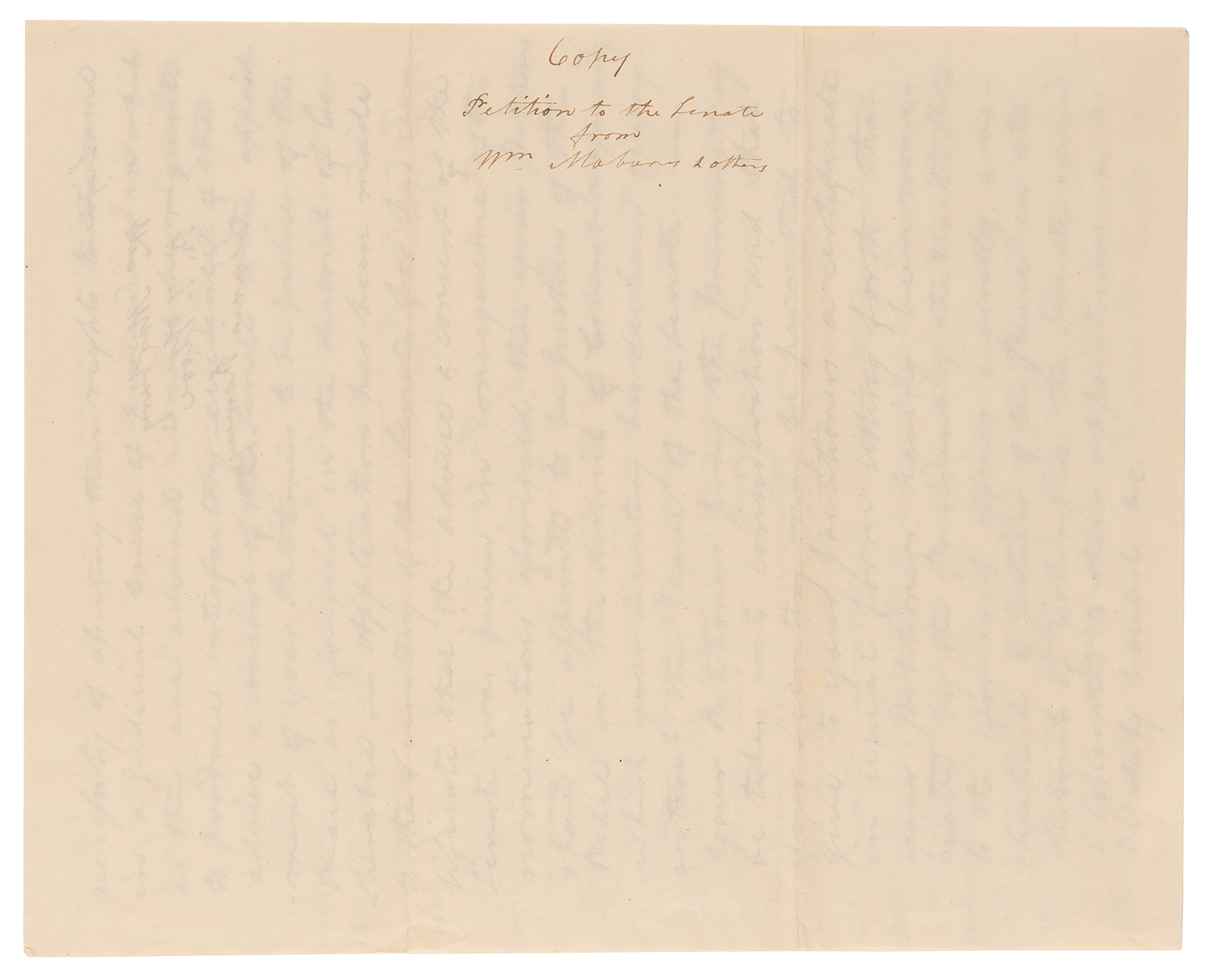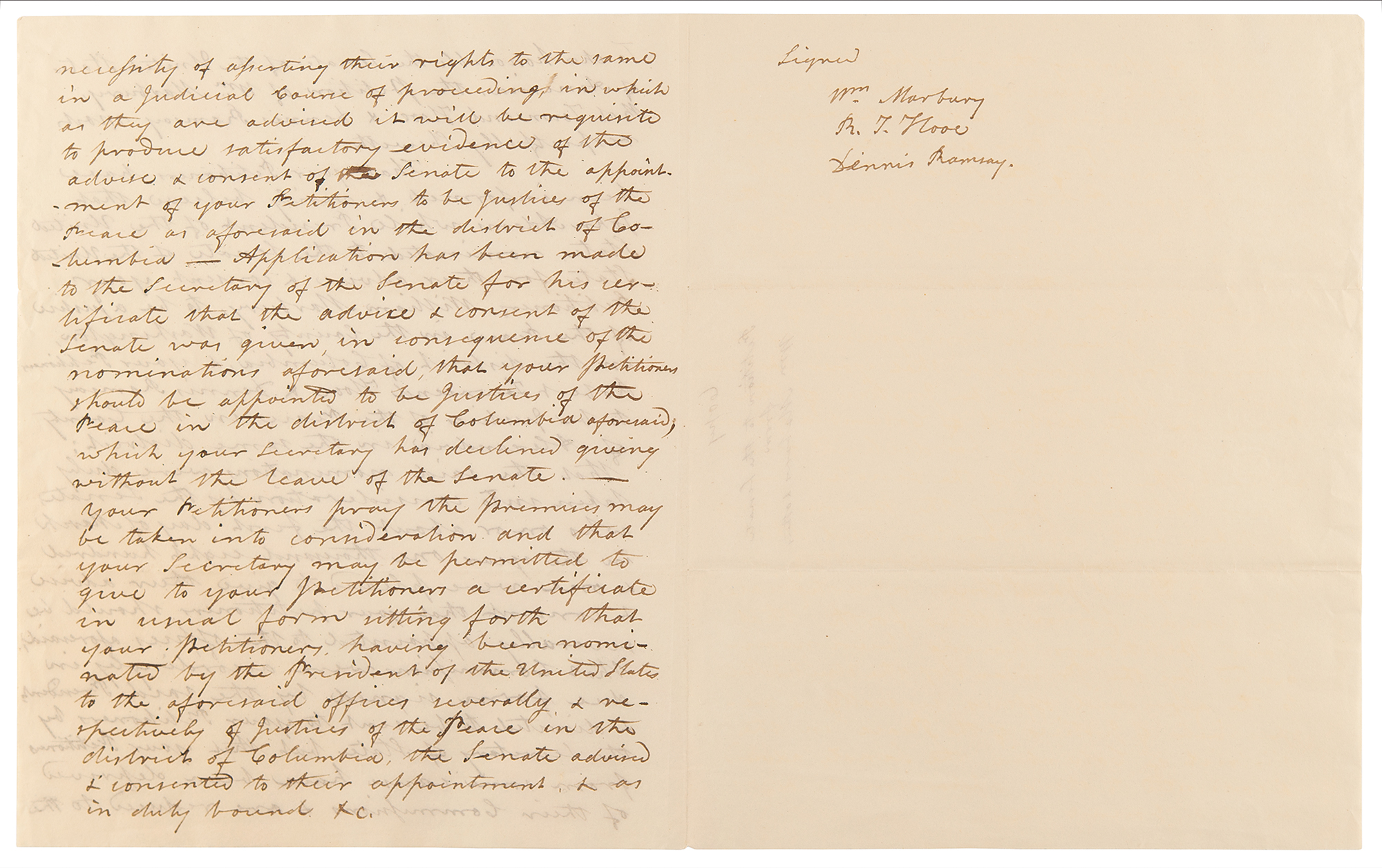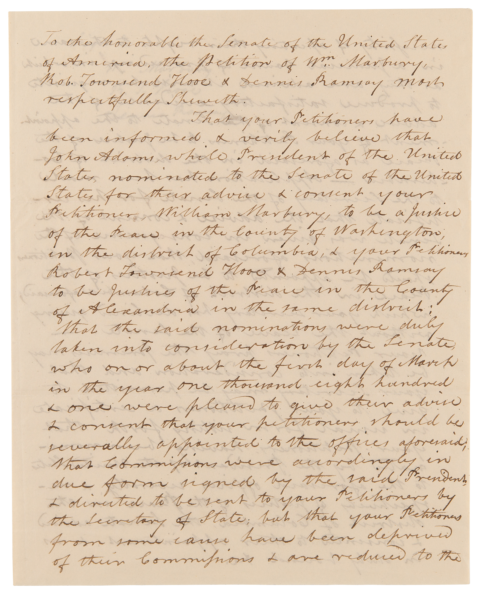 The petition begins, in part: "To the honorable the Senate of the United States of America, the petition of Wm. Marbury, Rob. Townsend Hooe & Dennis Ramsay most respectfully sheweth, That your Petitioners have been informed & verily believe that John Adams, while President of the United States, nominated to the Senate of the United States, for their advice & consent your petitioner, William Marbury, to be a Justice of the Peace in the County of Washington, in the district of Columbia, & your Petitioners Robert Townsend Hooe & Dennis Ramsay to be Justices of the Peace in the County of Alexandria, in the same district; that the said nominations were duly taken into consideration by the Senate, who on or about the first day of March…were pleased to give their advice & consent that your petitioners should be severally appointed to the offices aforesaid; that commissioners were accordingly in due form signed by the said President, & directed to be sent to your Petitioners by the Secretary of States; but that your Petitioners from some cause have been deprived of their Commissions & are reduced to the necessity of asserting their rights to the same in a judicial court of proceedings, in which as they are advised it will be requisite to produce satisfactory evidence of the advice & consent of the Senate to the appointment…Application has been made to the Secretary of the Senate for his certificate that the advice & consent of the Senate was given in consequence of the nominations aforesaid, that your petitioners should be appointed to be Justices of the Peace in the District of Columbia, which your secretary has declined giving without the leave of the Senate." In fine condition.