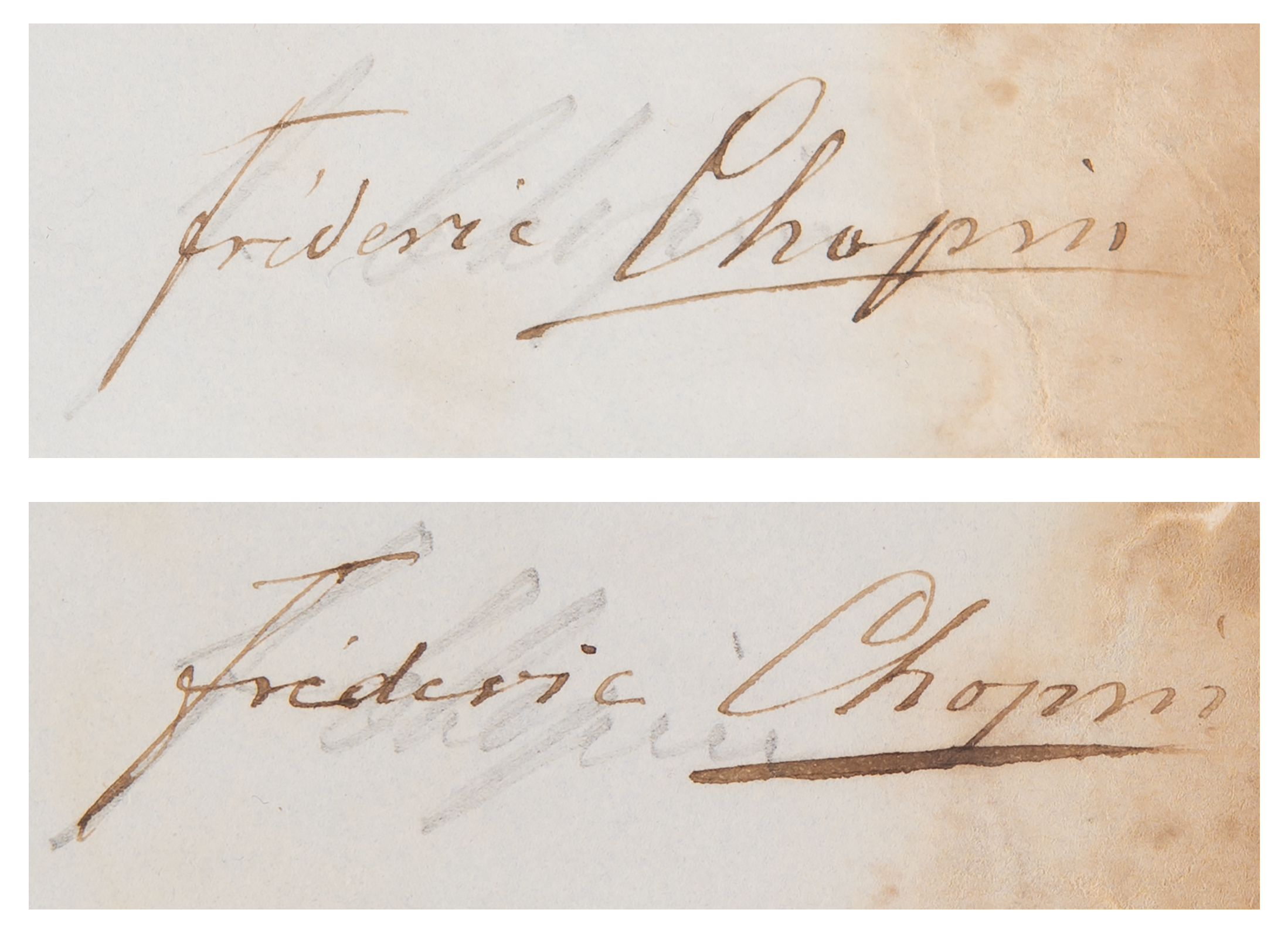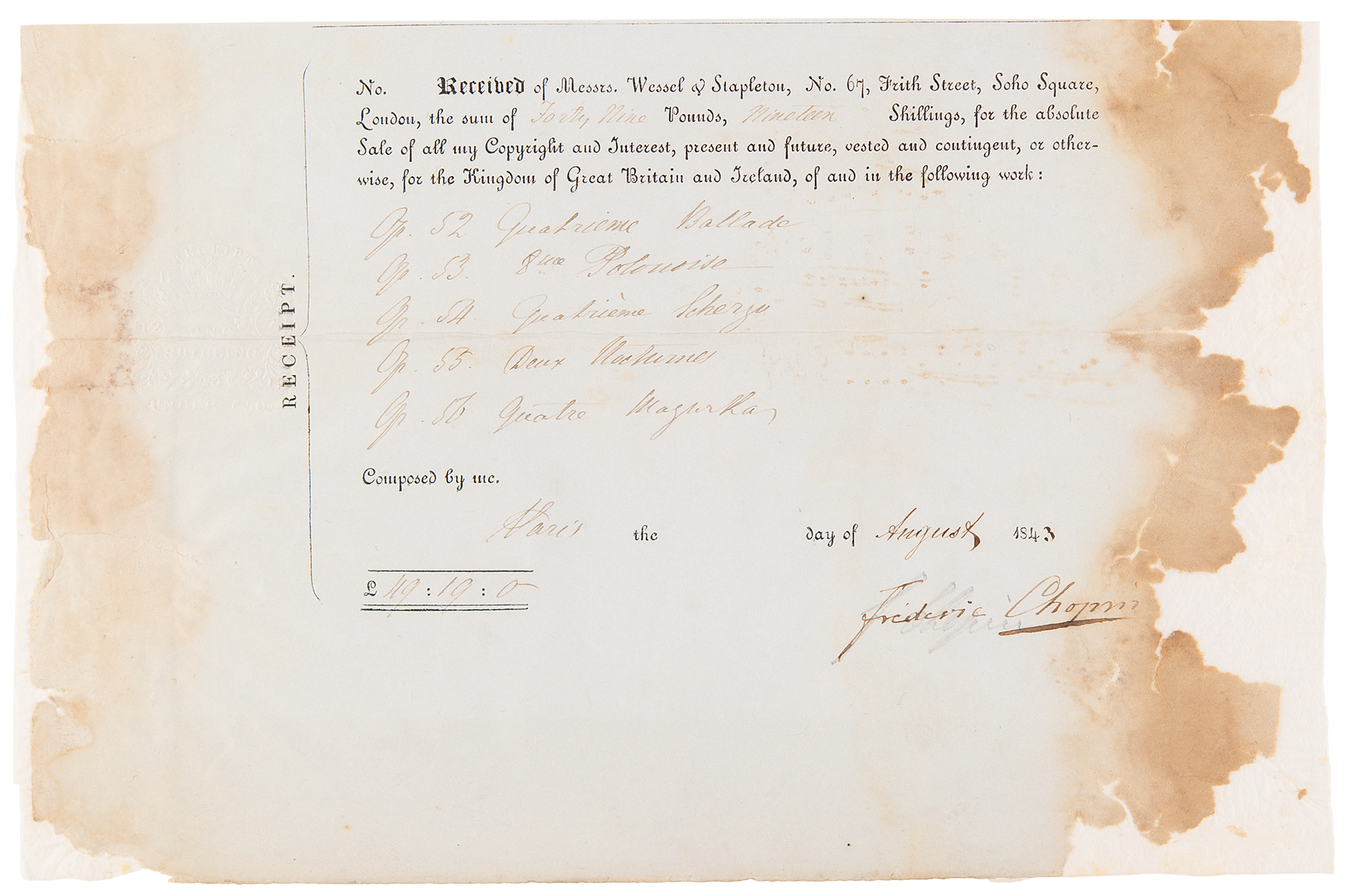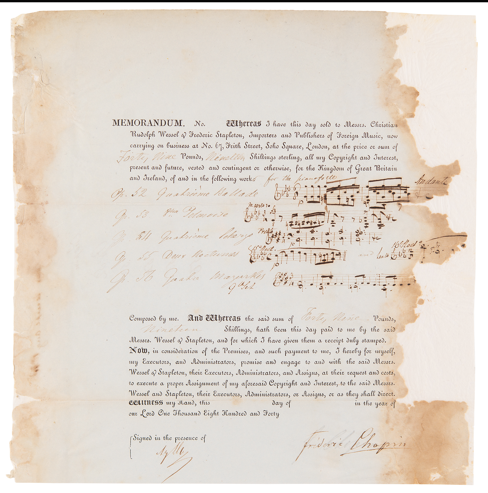 Two rare partly-printed self-contained DSs in French, each signed, “Frederic Chopin,” two pages, 9.75 x 10 and 9.75 x 6.5, August 1843. An assignment of copyright for five of his significant works, plus the receipt confirming payment. In part: "I have this day sold to Messrs. Christian Rudolph Wessel & Frederic Stapleton, Importers and Publishers of Foreign Music…at the price or sum of Forty Nine Pounds, Nineteen Shillings sterling, all my Copyright and Interest, present and future…for the Kingdom of Great Britain and Ireland, of and in the following works for the pianoforte: Op. 52 Quatrieme Ballade, Op. 53 8eme Polonaise, Op. 54 Quatrieme Scherzo, Op. 55 Deux Nocturnes, Op. 56 Quatre Mazurkas." Next to each title is a brief musical quote from the beginning of the piece, penned by an amanuensis. By the second document, apparently cut from the conclusion of the above, Chopin acknowledges his receipt of £49.19.0 for the sale of the publishing rights to these works. On both, Chopin signs in ink over a still-visible pencil guideline. In very good condition, with edge staining touching the tail end of each signature, and professional archival backing to reinforce paper loss to the edges.