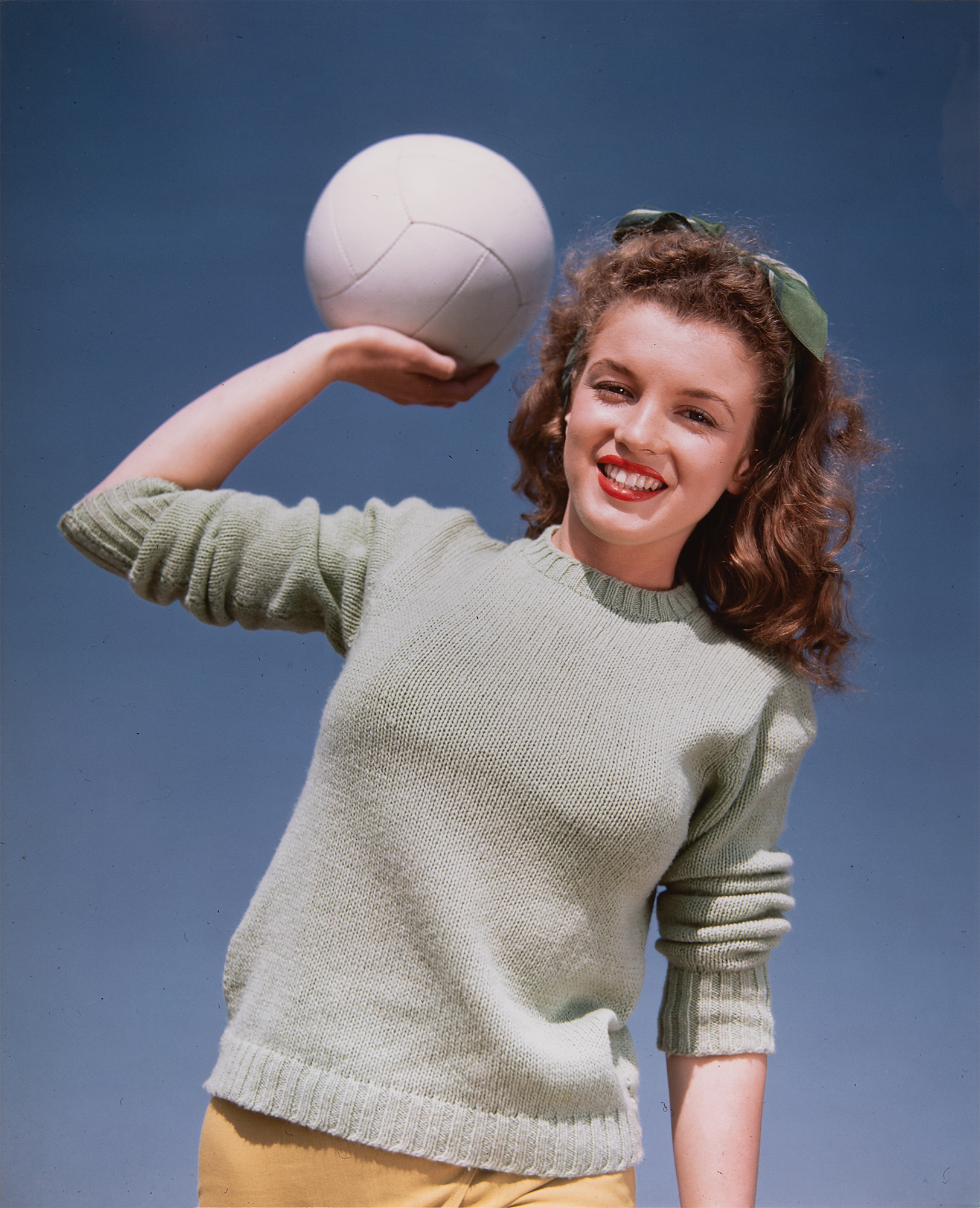 Impressive color glossy 16 x 20 cibachrome print of the youthful Marilyn Monroe, a stunning portrait originally taken by Andre de Dienes in 1945 and printed later. The sharp image shows the aspiring actress in a green knit sweater, holding a volleyball on the beach in Malibu. Affixed to a same-size mount and in fine condition.