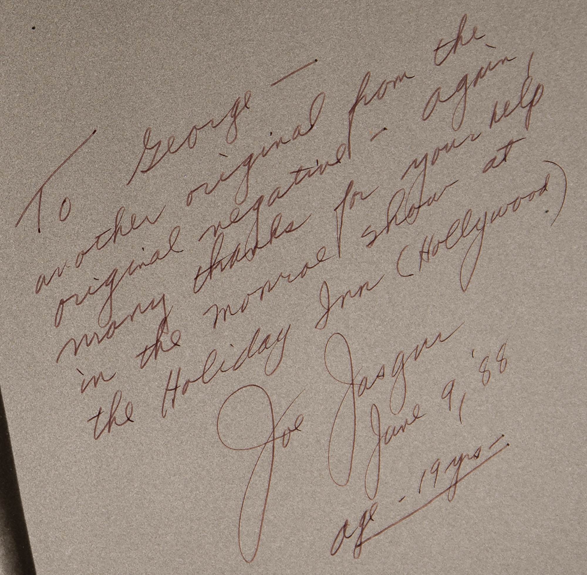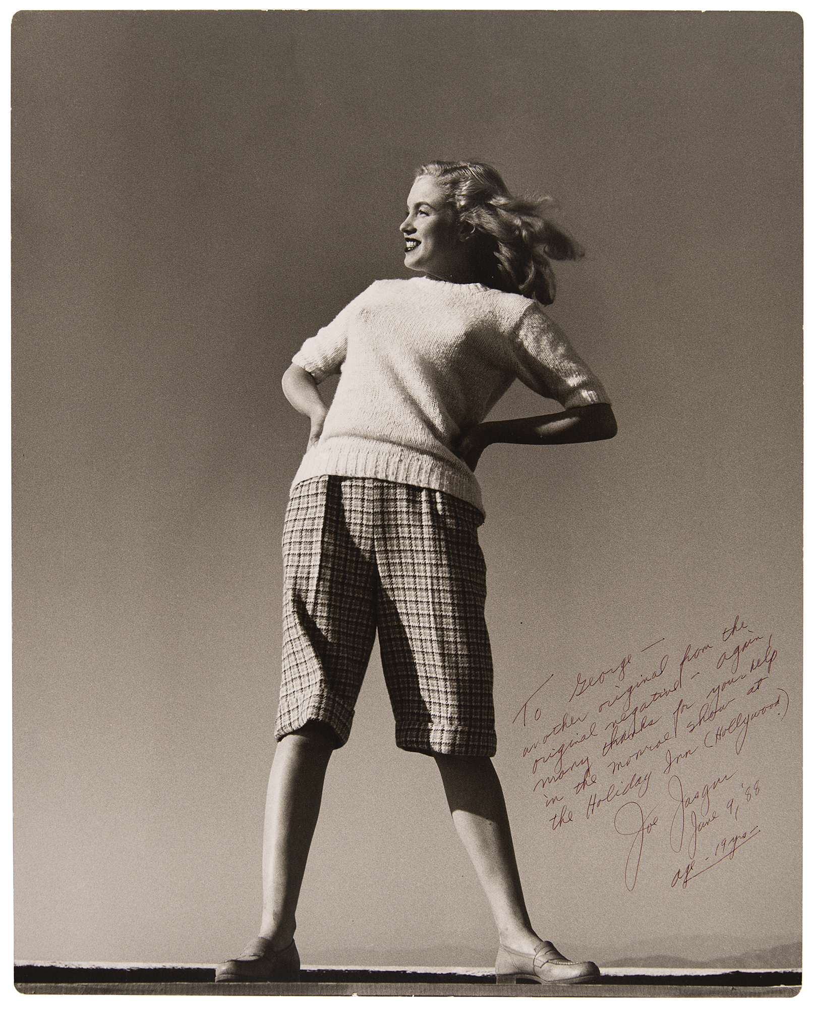 Original matte-finish 16 x 20 photograph of Marilyn Monroe standing in a snug sweater and plaid pants, originally taken by Joseph Jasgur in 1946 and printed later from the original negative, signed and inscribed in ink to fellow photographer George Hurrell, "To George—another original from the original negative—again many thanks for your help in the Monroe show at the Holiday Inn (Hollywood). Joe Jasgur, June 9, '88, Age—19 yrs." In fine condition. A classic, early image of Marilyn Monroe and a wonderful association piece as a presentation from one photographer to another.