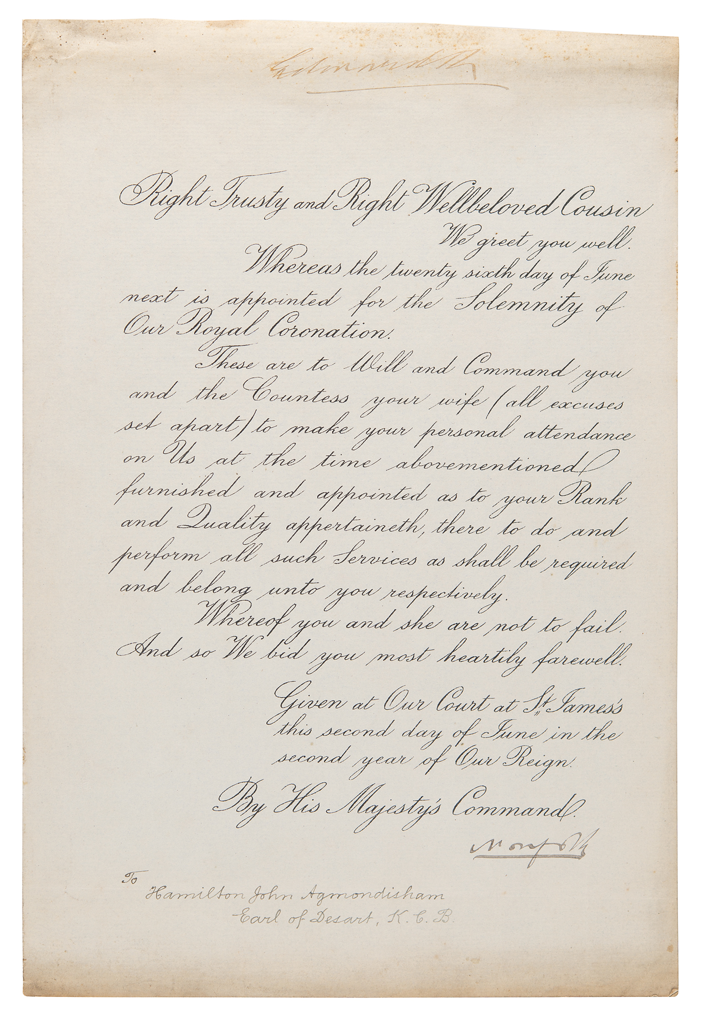 Rare official royal summons for the coronation of King Edward VII and Queen Alexandra, signed “Edward R.,” one page, 8 x 11.75, June 2 [1902]. The summons, issued to Hamilton Cuffe, 5th Earl of Desart, reads: “Whereas the twenty sixth day of June next is appointed for the Solemnity of Our Royal Coronation. These are to Will and Command you and the Countess your wife (all excuses set apart) to make your personal attendance on Us at the time abovementioned, furnished and appointed as to your Rank and Quality appertaineth, there to do and perform all such Services as shall be required and belong unto you respectively. Whereof you and she are not to fail. And so We bid you most heartily farewell. Given at Our Court at St. James’s this second day of June in the second year of Our Reign.” Signed in the upper border by the king and countersigned below by the Duke of Norfolk. In very good to fine condition, with some foxing and toning to the lightly trimmed top edge.