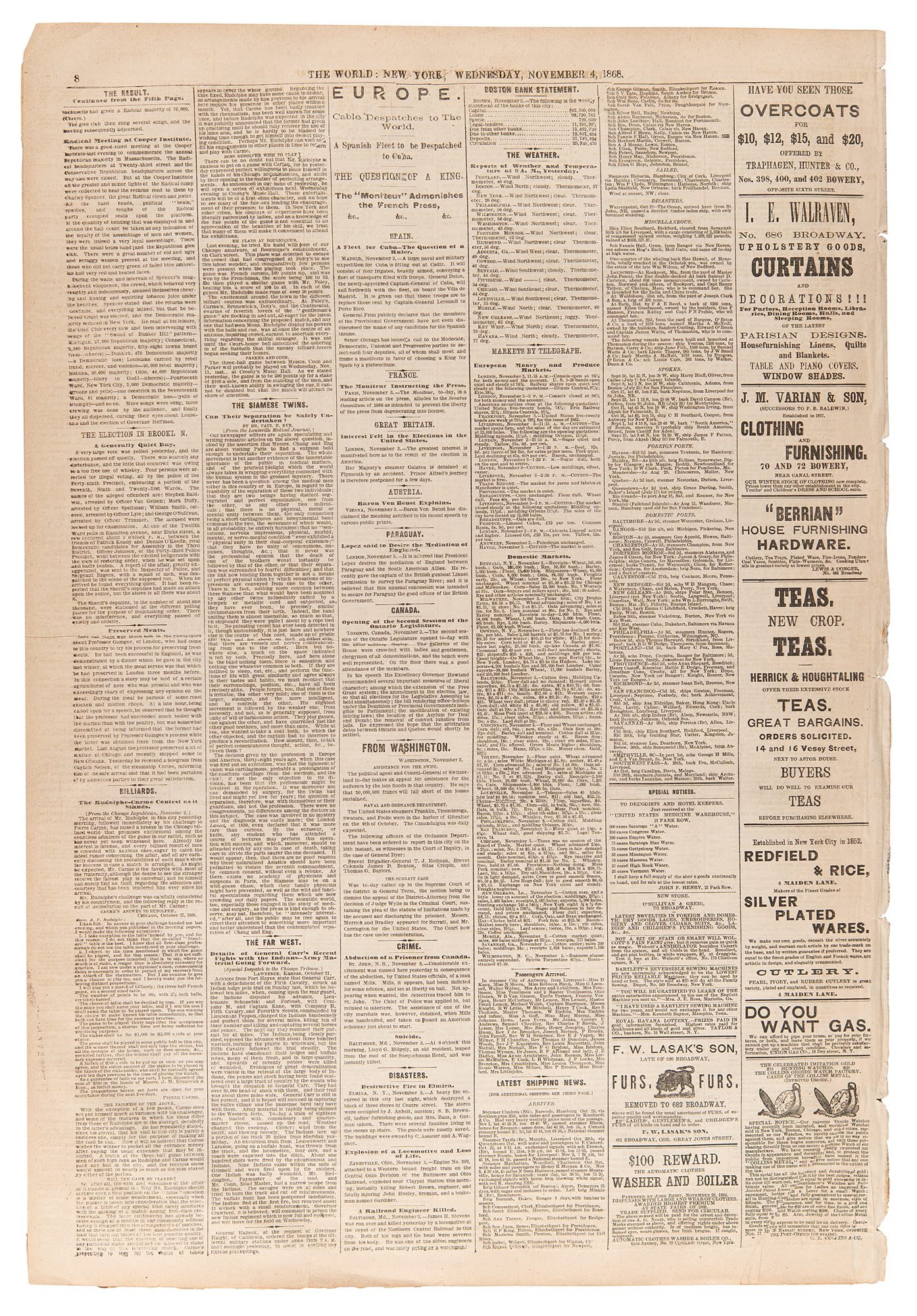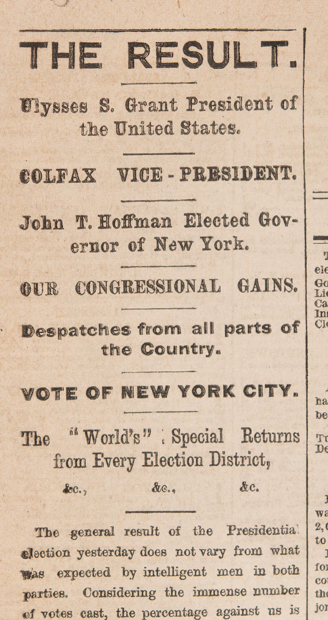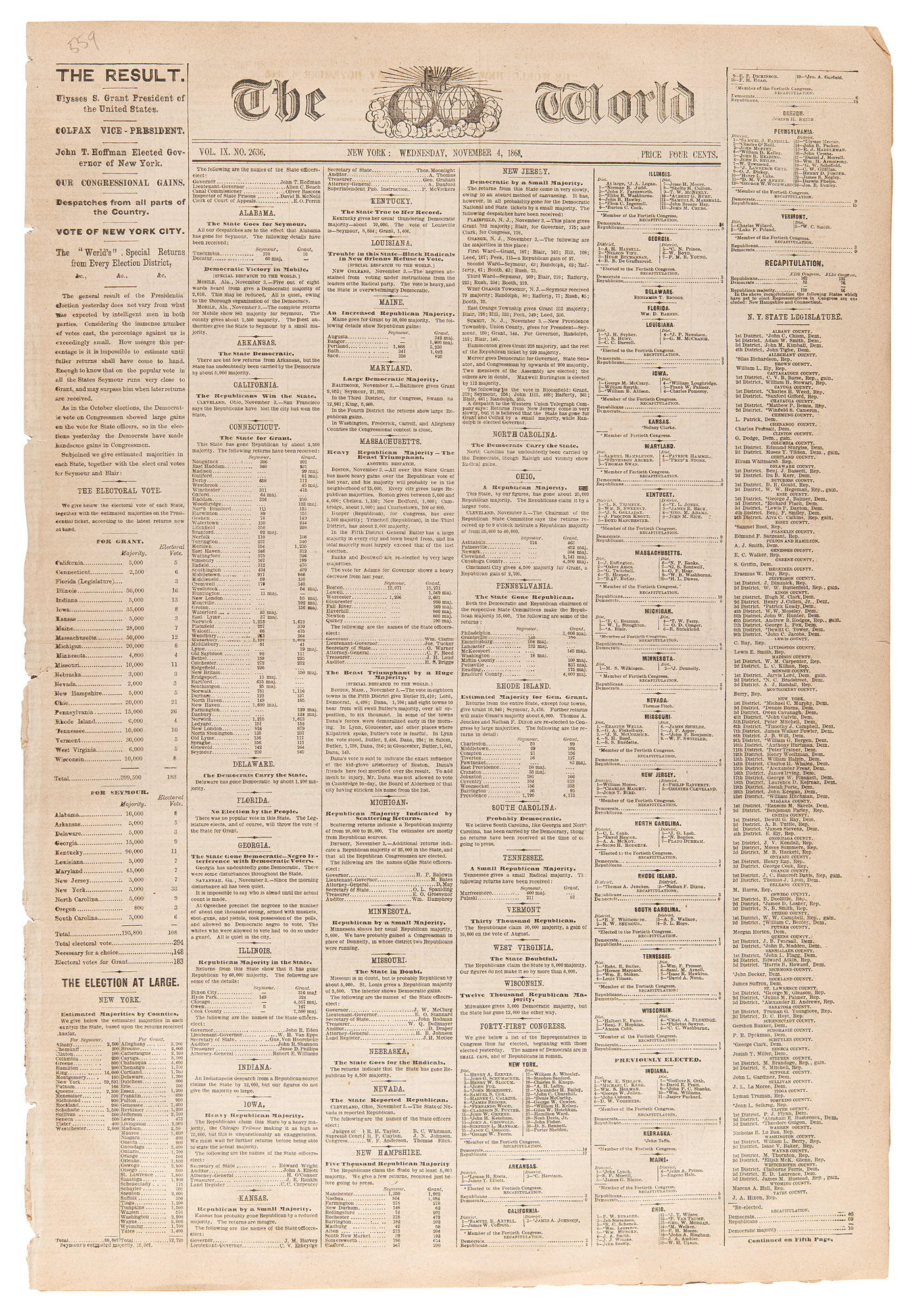 Complete issue of the New York newspaper The World from November 4, 1868, eight pages, 15.5 x 22.5, containing results of the 1868 United States presidential election that announced Republican nominee Ulysses S. Grant as the victor, with headlines in bold: “THE RESULT.,” “Ulysses S. Grant President of the United States,” and “Colfax Vice-President.” The lead article begins: “The general result of the Presidential election yesterday does not vary from what was expected by intelligent men in both parties;” The paper continues with reports on the results of the electoral college vote and with reports from across the country. In very good to fine condition, with a horizontal fold and wear to edges.