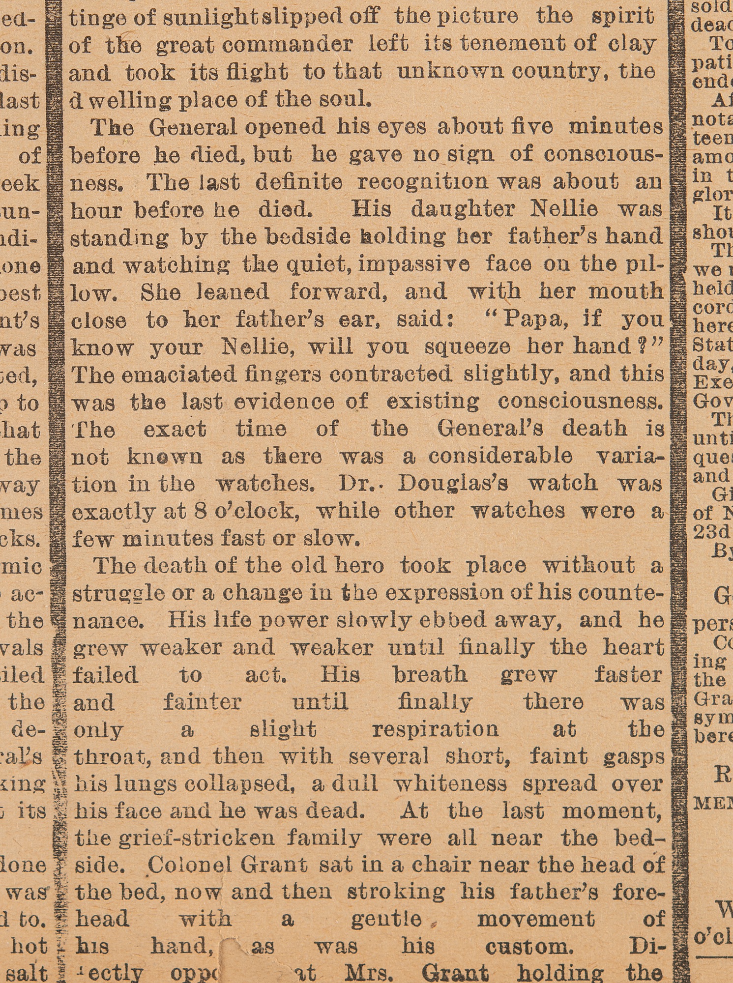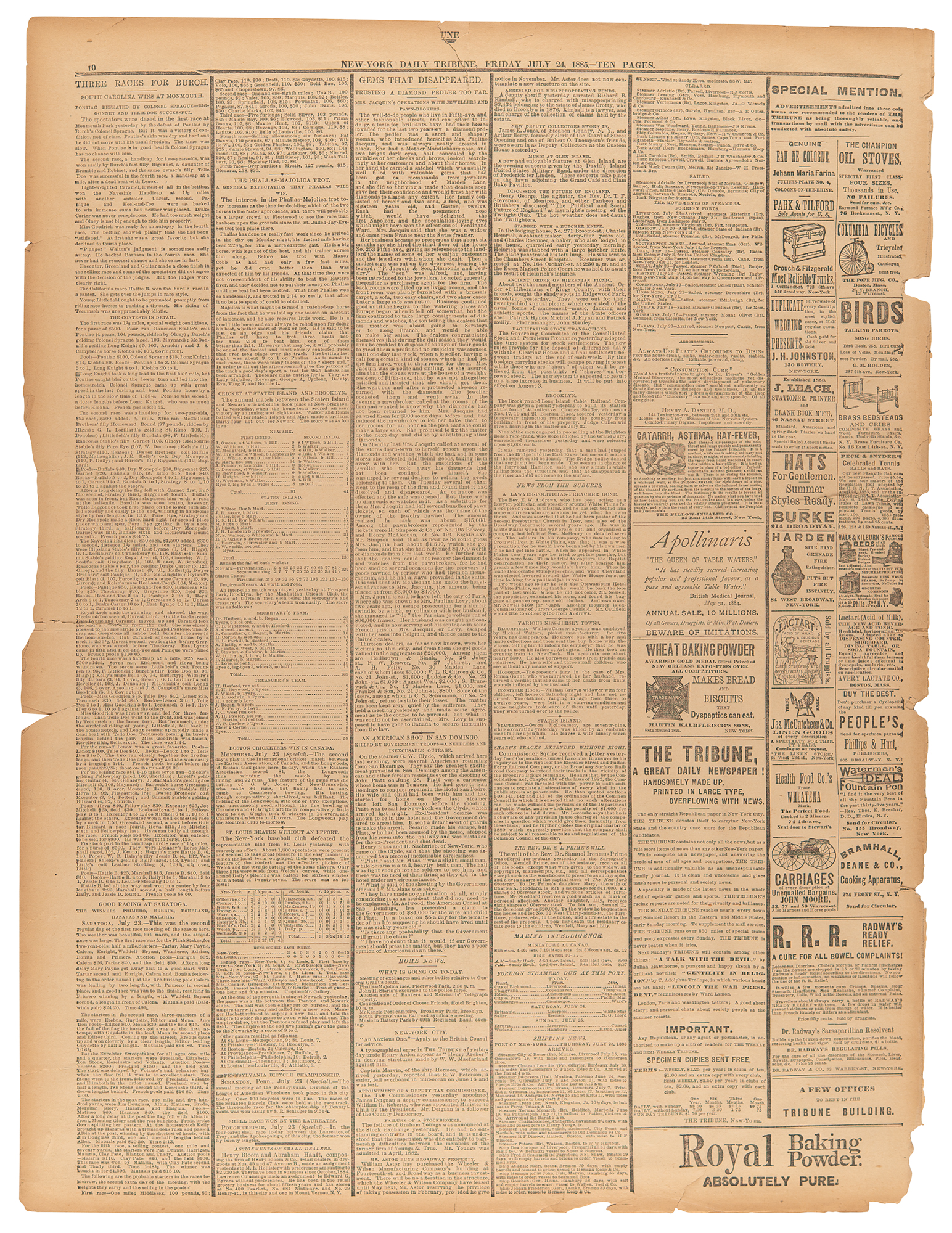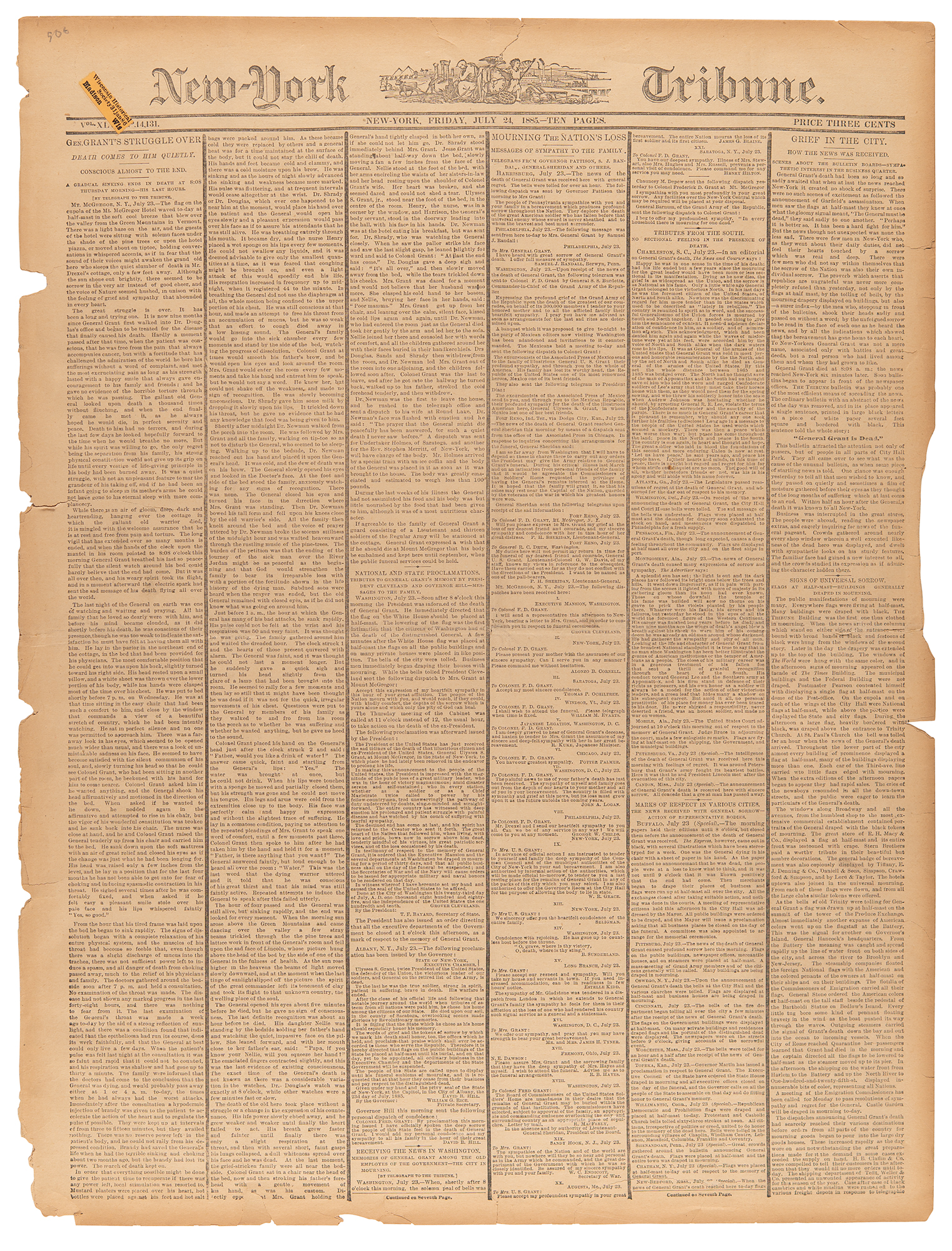 Complete issue of The New-York Tribune from July 24, 1885, 10 pages, 18 x 23.75, with the front page featuring black ‘mourning’ borders and reporting on the death of former American President U. S. Grant. Headlines read: “Gen. Grant’s Struggle Over,” “Death Comes to Him Quietly,” and “Conscious Almost to the End.” The newspaper contains riveting, lengthy reports from the death room, including: “The General opened his eyes about five minutes before he died, but he gave no sign of consciousness. The last definite recognition was about an hour before he died. His daughter Nellie was standing by his bedside holding her father’s hand and watching the quiet, impassive face on the pillow. She leaned forward and with her mouth close to her father’s ear said: ‘Papa, if you know your Nellie, will you squeeze her hand?’ The emancipated fingers contracted slightly, and this was the last evidence of existing consciousness.” In very fragile condition, with several tears to the brittle edges.