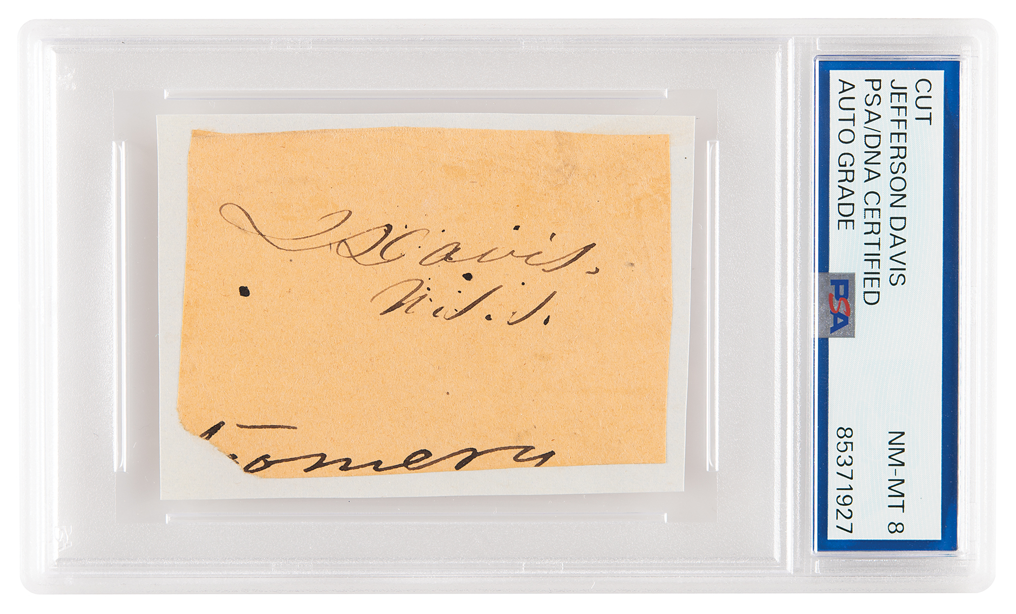 Ink signature as a Mississippi senator, "J. Davis, U.S.S.,” on an off-white 2.75 x 1.75 slip affixed to a slightly larger sheet. In fine condition. Encapsulated and graded by PSA/DNA as “NM-MT 8.”