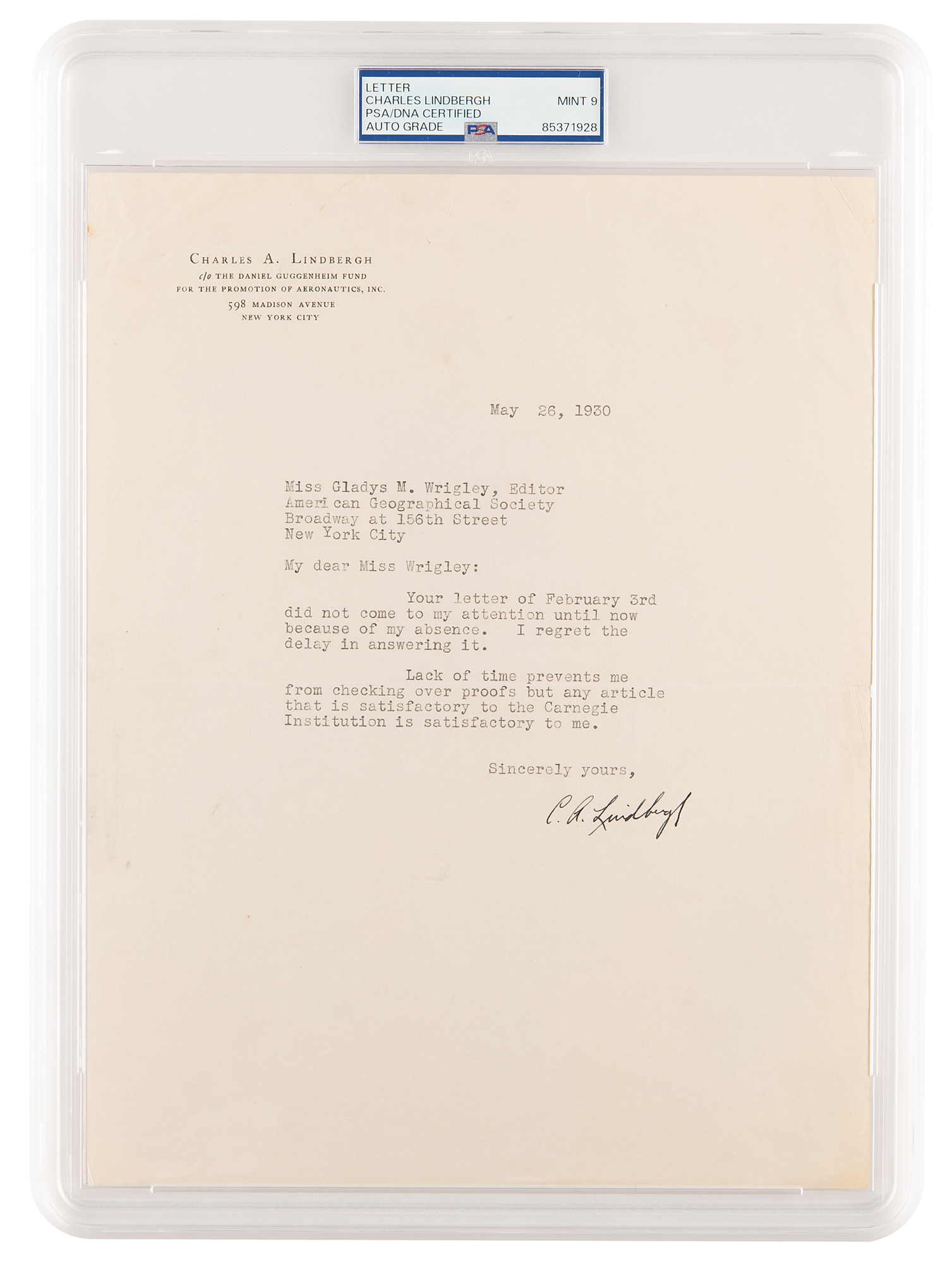 TLS signed “C. A. Lindbergh,” one page, 8.5 x 11, personal letterhead, May 26, 1930. Letter to Miss Gladys M. Wrigley, editor for the American Geographical Society, in part: "Lack of time prevents me from checking over proofs but any article that is satisfactory to the Carnegie Institution is satisfactory to me." In fine condition, with some light corner creasing. Encapsulated and graded by PSA/DNA as “MINT 9.”