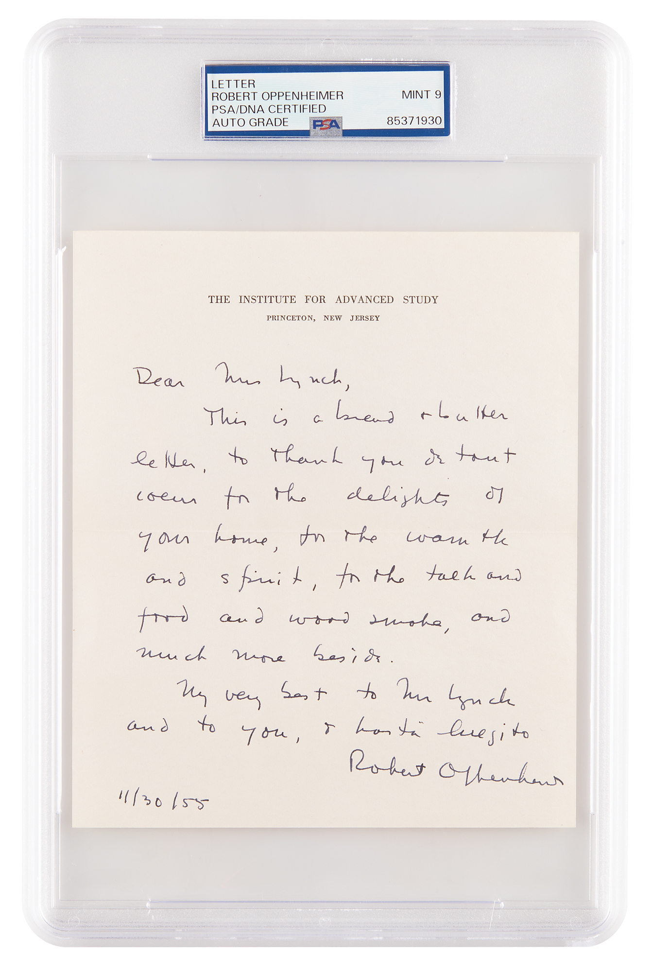 ALS, one page, 5.5 x 6.5, The Institute for Advanced Study (Princeton, New Jersey) letterhead, November 30, 1955. Handwritten letter to the wife of educator Ransom Lynch of Exeter, New Hampshire, in full: “This is a bread & butter letter to thank you de tout couer for the delights of your home, for the warmth and spirit, for the talk and food and wood smoke, and much more besides. My very best to Mr. Lynch and to you, & hasta luegito.” In fine condition. Encapsulated and graded by PSA/DNA as “MINT 9.” Accompanied by the original hand-addressed mailing envelope.