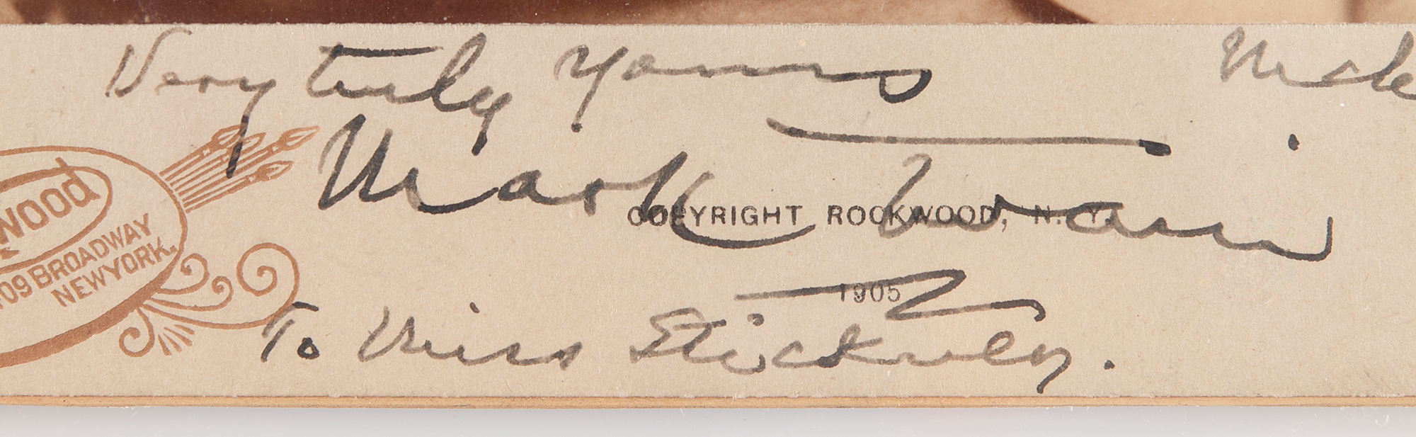Outstanding 4.25 x 6.5 cabinet photo of Samuel L. Clemens by Rockwood of New York, nicely signed and inscribed on the mount in ink, "Very truly yours, Mark Twain, To Miss Stickney, March 10/06.” In fine condition, with light scuffing to the front of the portrait, and old mounting remnants on the back. Encapsulated and graded by PSA/DNA as “NM-MT 8.”