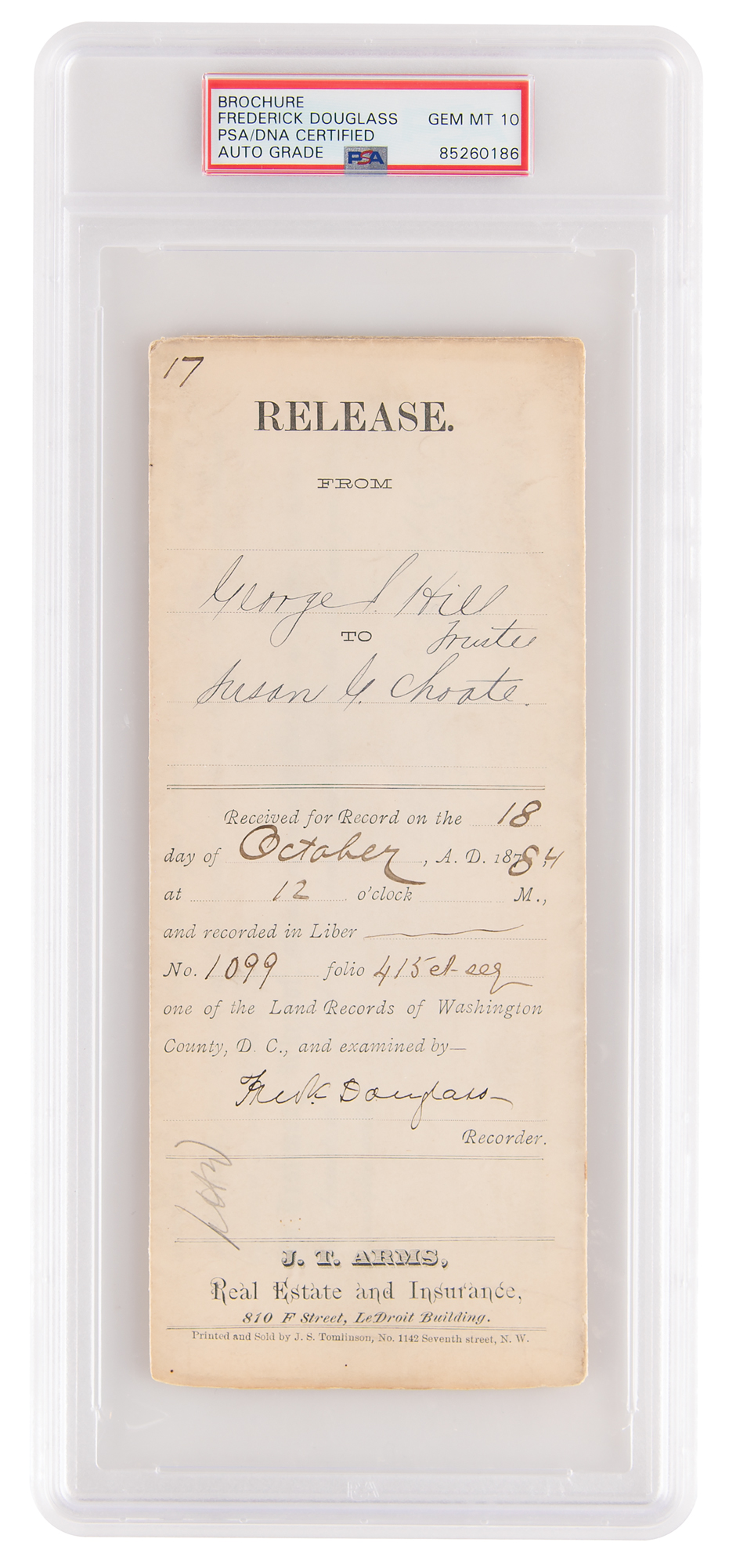 Partly-printed DS, signed “Fred'k Douglass,” folded to 3.5 x 8.5, October 18, 1884. Release from George L. Hill to Susan G. Choate, signed on the docketing panel in ink by Frederick Douglass as recorder of deeds for the District of Columbia. In fine condition. Encapsulated by PSA/DNA and graded as "GEM MT 10."