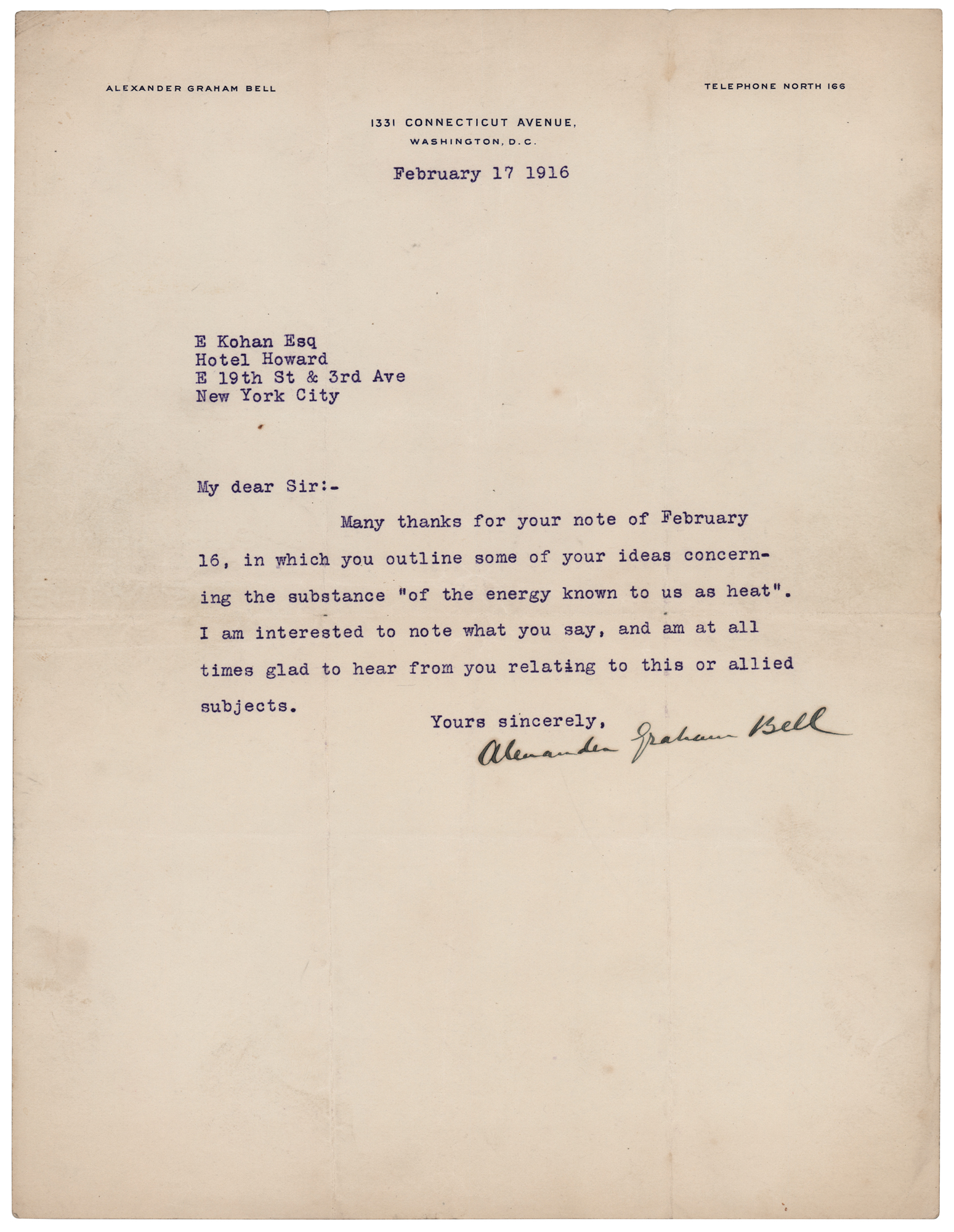 TLS, one page, 8.5 x 11, personal letterhead, February 17, 1916. Letter to E. Kohan, in full: “Many thanks for your note of February 16, in which you outline some of your ideas concerning the substance ‘of the energy known to us as heat.’ I am interested to note what you say, and am at all times glad to hear from you relating to this or allied subjects.” In fine condition.